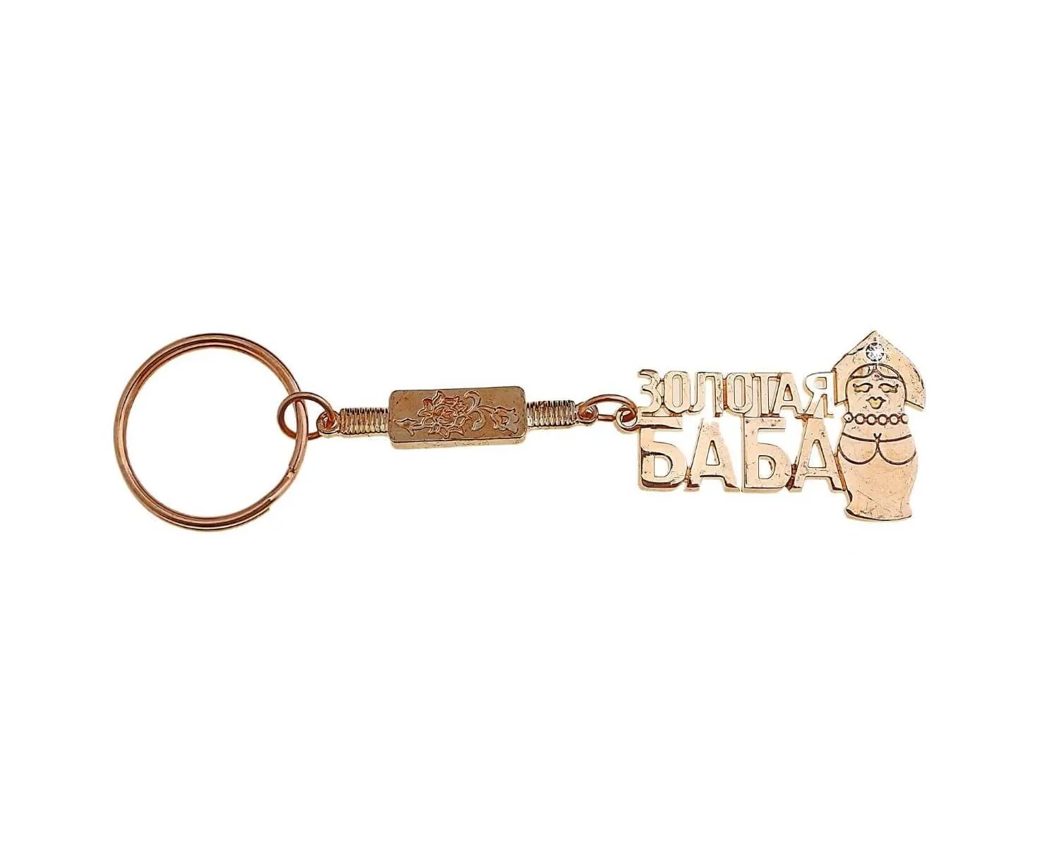 Металлический брелок «Золотая баба» от российского производителя Сима Ленд станет прекрасным подарком к любому празднику или просто забавным сувениром без повода. На колечке размещается золотистая подвеска в виде соответствующей надписи и миниатюрный значок с цветком и фигурка женщины в кокошнике. Брелок отлично подойдет в качестве украшения для ключей от дома, работы или автомобиля.