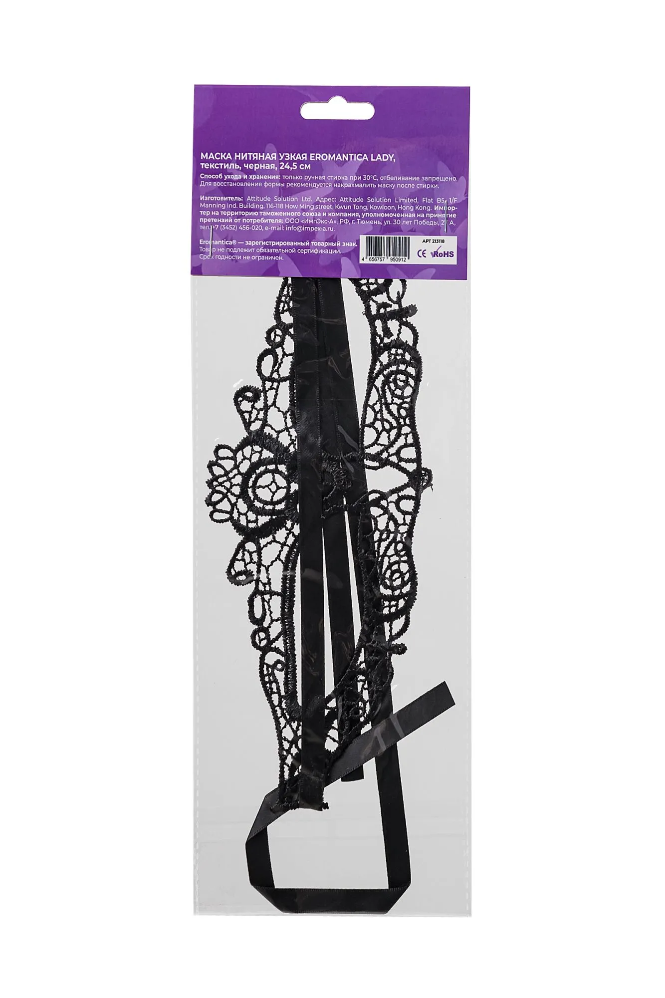 —Маска нитяная узкая Eromantica Lady, текстиль, черная, 24,5 см