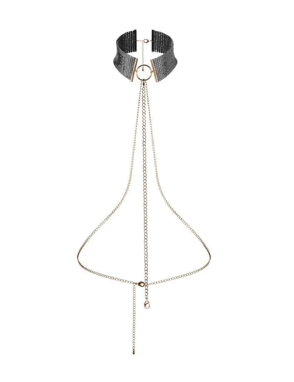 Элегантное колье Desir Metallique от бренда Bijoux Indiscrets - это необычный аксессуар, который можно использовать и как изысканное украшение, и как ошейник. Две цепочки проходят по линии груди и застегиваются на спине, а третья может использоваться в качестве поводка во время ролевых игр, однако при желании ее можно снять.