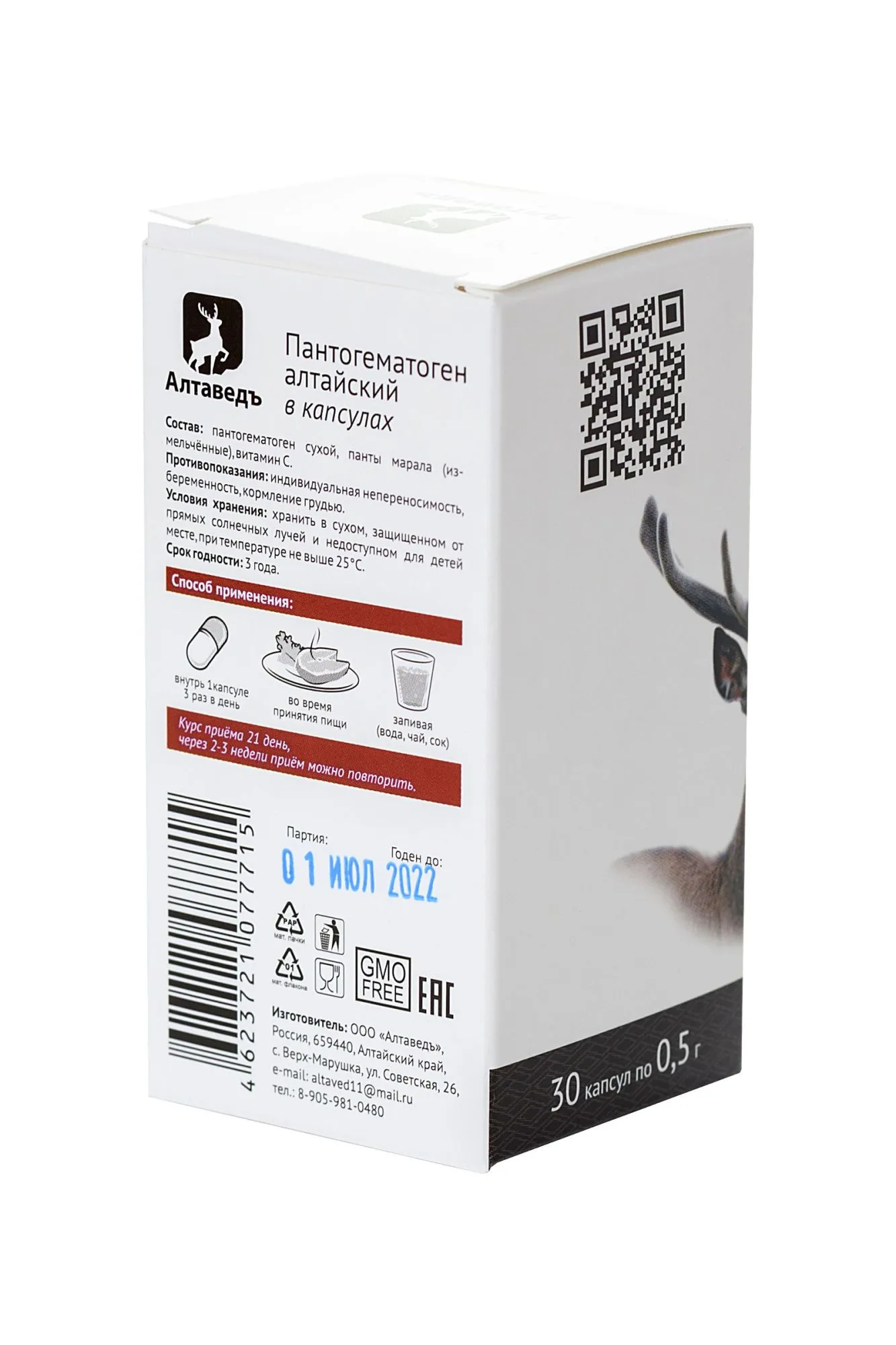 Капсулы “Пантогематоген” от АлтаВедъ — природный биостимулятор, пробуждающий внутренние резервы организма и восстанавливающий физиологические функции. увеличивает потенцию и усиливает эрекцию мужчин повышает либидо у женщин обладает общеукрепляющим и иммуномодулирующим эффектом стимулирует работу сердечно-сосудистой системы регулирует артериальное давление понижает холестерин устраняет зашлакованность организма питает мозг кислородом и делает память лучше улучшает работоспособность и выносливость уменьшает уровень стресса при перенапряжении (физическом и умственном) замедляет процесс старения половой системы и организма в целом эффективен при лечении опорно-двигательной и центральной нервной систем способствует регенерации тканей (в том числе костей) Полностью натуральный состав — пантогематоген сухой (кровь марала), панты марала сухие, витамин С. Панты марала помогают справиться с переутомлением, половой слабостью, неврозом. Пантогематоген – натуральный источник железа, пробуждает и поднимает иммунитет. Витамин С важен для нормальной работы сердечно-сосудистой системы. Рекомендации по применению: употреблять внутрь по 1 капсуле 3 раза в день во время еды, запивая жидкостью (вода, чай, сок). Противопоказания: Индивидуальная непереносимость компонентов. Форма выпуска: 30 капсул массой 0,5 г БАД, НЕ ЯВЛЯЕТСЯ ЛЕКАРСТВОМ.