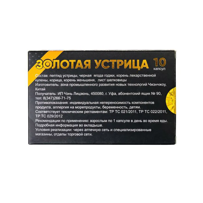 Откройте двери к новым уровням удовольствия с капсулами "Золотая устрица" - натуральным сокровищем из мира растительных афродизиаков. В отличие от химических препаратов, здесь вы найдете силу природы без побочных эффектов. Секрет "Золотой устрицы" заключается в ее уникальной формуле, где 49% - это мощный пептид устрицы, старинный афродизиак, признанный природой.