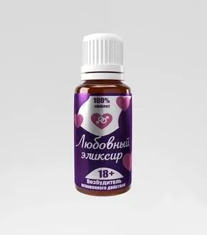 Способ применения: 5-10 капель растворить в жидкости за 10-20 минут до секса. Эликсир не является лекарственным средством, возможны побочные действия. Условия хранения: при температуре от +5 до +25 С, без прямого попадания солнечных лучей, хранить в недоступном для детей месте. Номинальный объем: 20 мл. Состав: Вода питьевая, сорбат калия, бензоат натрия, стевиозид, дииндолил метан, экстракт муира пуама, экстракт эхинацеи, экстракт дамианы, лимонная кислота. Это легендарный продукт, в состав которого, входят ингредиенты, издавна славившиеся как лучший стимулятор сексуального желания. Эликсир любви обогащен афродизиаками и экстрактами, которые стимулируют ваши желания и вызывают жажду секса. Эликсир поможет паре достичь невероятных сексуальных результатов – значительно повышает возбудимость обоих партнеров, ночь с применением этих капель будет незабываемой!