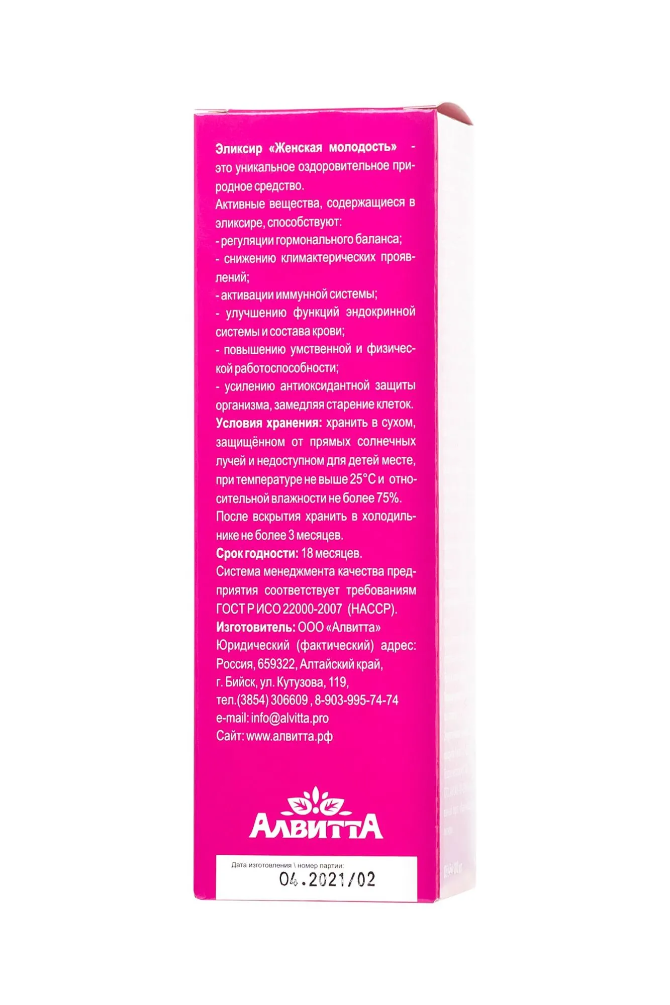Концентрированный эликсир «Женской молодости» на соке черники из 15 растительных компонентов -это уникальное оздоровительное природное средство. Активные вещества, содержащиеся в эликсире, способствуют: регуляции гормонального баланса, снижению климактерических проявлений активации иммунной системы, улучшению функций эндокринной системы и состава крови, повышению умственной и физической работоспособности, усилению антиоксидантной защиты организма, замедляя старение клеток. Не содержит сахара, спирта, искусственных ароматизаторов и красителей Способ применения: 1-2 чайной ложки эликсира добавлять в напитки (чай, кофе, минеральную, газированную воду) для усиления вкуса и обогащения организма природными компонентами. Противопоказания: индивидуальная непереносимость компонентов, беременность. Объём: 200мл