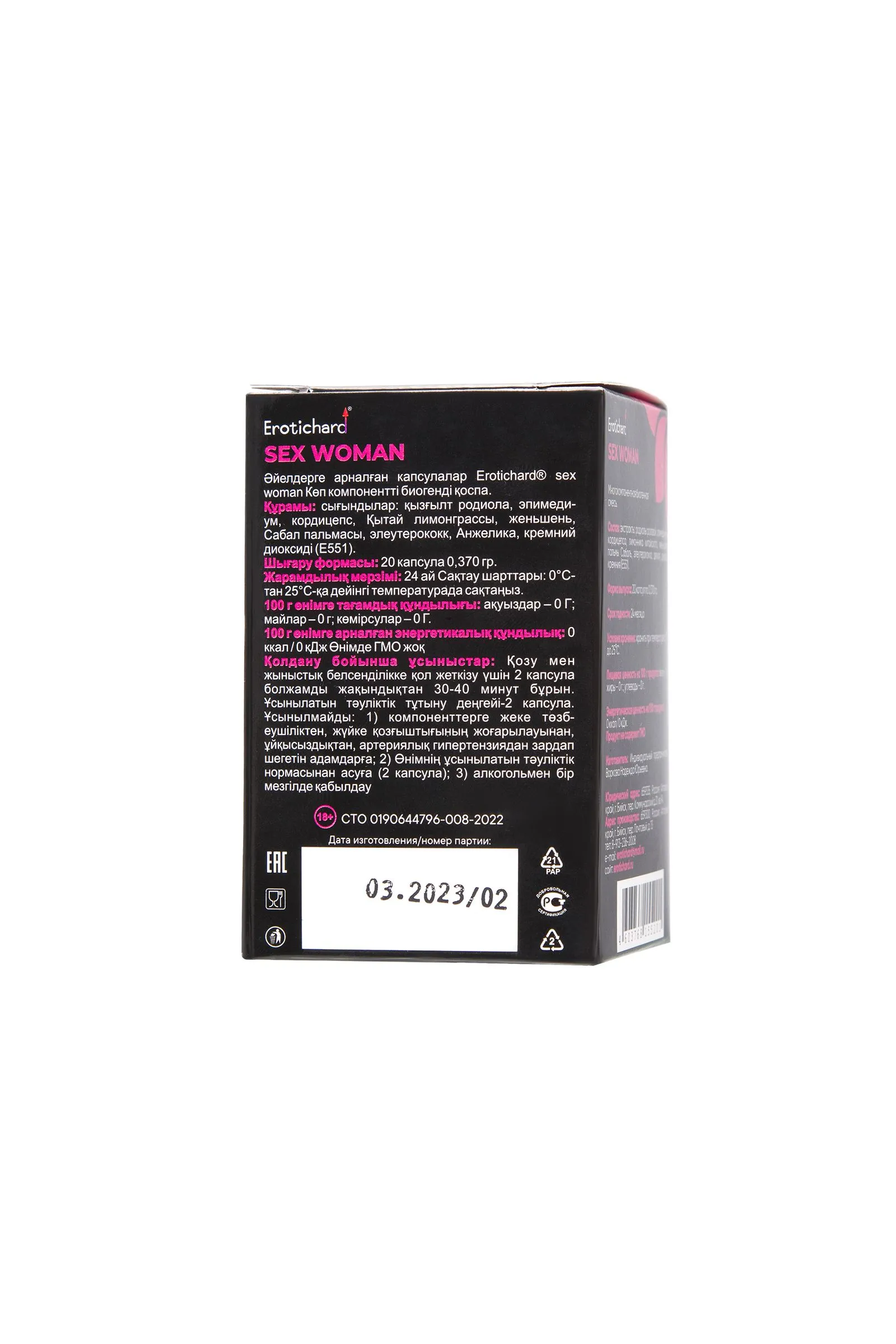 В любом возрасте женщины хотят оставаться сексуально активными, молодыми, соблазнительными и жизнерадостными. Биогенный комплекс растительных экстрактов Erotichard® sex women в капсулах – это возбуждающее средство растительного происхождения для женщин. Природный источник минералов, микроэлементов, антиоксидантов, аминокислот, гликозидов и фитонутриентов. Положительный эффект обеспечивают входящие в состав компоненты растительного происхождения. Капсулы благотворно воздействуют на половую функцию, поддерживают гормональный баланс, увеличивают энергию, выносливость и продлевают молодость. Erotichard® sex women деликатно способствует возбуждению и повышению либидо. Активные компоненты усиливают кровообращение в области органов малого таза. Половые органы и грудь становятся крайне чувствительными, набухают и отзываются повышенной реакцией на прикосновения. Капсулы Erotichard® sex women положительно воздействуют на работу всех основных систем организма, способствуя укреплению иммунитета и улучшению самочувствия. Эффект наступает через 40 минут-1,5 часа. Для достижения максимальной эффективности необходим курсовой прием. Биогенный комплекс растительных экстрактов Erotichard® sex women в капсулах способствует: повышению либидо увеличению сексуальной активности обострению чувственных ощущений во время близости улучшению состояния при хронической усталости, депрессии, нервном истощении и перенапряжении уменьшению симптомов ПМС и менопаузы. Рекомендации по применению: Для достижения возбуждения и сексуальной активности взрослым женщинам принимать по 2 капсулы за 30-40 минут до предполагаемой близости. Профилактический прием: по 1 капсуле в течение 14 дней. Состав: экстракты родиолы розовой, эпимедиума, кордицепса, лимонника китайского, женьшеня, пальмы Сабаль, элеутерококка, дягиля, диоксид кремния (Е551). Противопоказания: не рекомендуется лицам, страдающим индивидуальной непереносимостью компонентов, повышенной нервной возбудимостью, бессонницей, артериальной гипертензией; превышать рекомендуемую суточную норму продукта (2 капсулы); противопоказан одновременный прием с алкоголем, т.к. снижает эффективность действующих веществ. Прием капсул возможен за 30-40 минут до употребления алкоголя. При заболеваниях сердечно-сосудистой системы совместный прием с алкоголем исключен. Форма выпуска: капсулы по 0,370 гр. В упаковке 20 капсул.