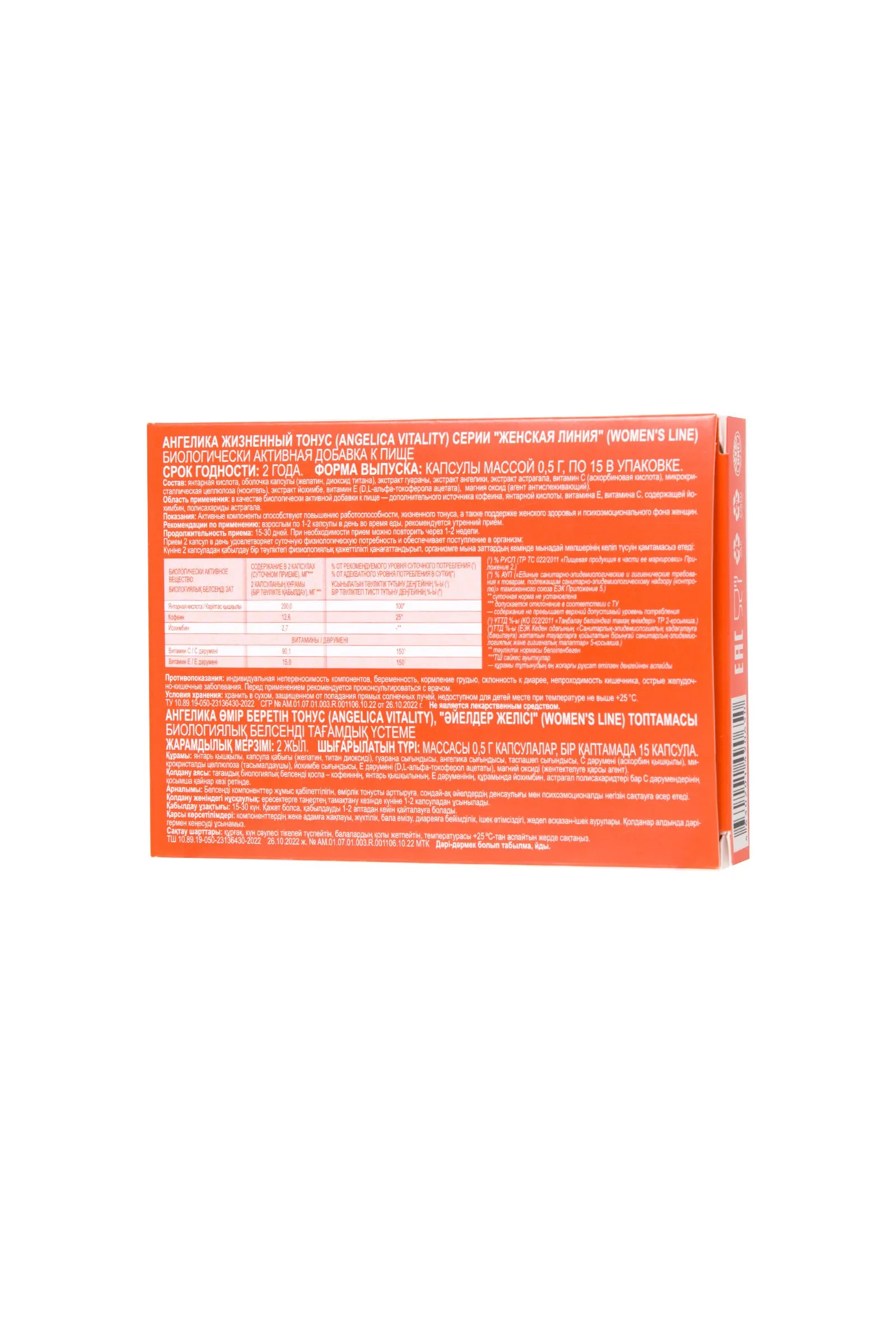 С древних времен экстракты растений использовались для поддержки женского здоровья. Комплекс Ангелика Жизненный Тонус (ANGELICA Vitality) разработан специально для женщин. В основе комплекса экстракты растений в сочетании с янтарной кислотой и витаминами. Биологически активные вещества компонентов Ангелика Жизненный Тонус способствуют: хорошему самочувствию женщины. повышению работоспособности и жизненного тонуса. поддержанию женской энергии, либидо и иммунитета. поддержке женского здоровья и психоэмоционального фона. Описание компонентов: Ангелика (Dong Quai (Донг Квай), Дягиль, Дудник) – “королева” женских трав. Травники называют ее «тоником для матки», так как биоактивные вещества Ангелики способствуют расширению кровеносных сосудов и улучшению кровообращения в матке, а также способствуют повышению сексуального желания и чувствительности женщины. Тонизирующая трава для поддержки женской репродуктивной системы, менструального цикла и при аменорее. Биологически активные вещества корней Ангелики: органические кислоты (феруловая кислота), фталиды (лигустилид, бутилиденфталид) и различные полисахариды, способствуют снижению нервного напряжения, поддержке иммунитета, снижению образования атеросклеротических бляшек на стенках кровеносных сосудов. Растение считается тонизирующим фитонутриентом для женщин с усталостью и низким жизненным тонусом. Астрагал (Huangqi, Хуан-ци) – используется в традиционной китайской медицине, как тонизирующее растение, для долголетия, для укрепления ци (жизненной энергии) и для повышения выносливости. Изофлавоноиды, сапонины (астрагалозиды) и полисахариды – это три основных типа биоактивных соединений астрагала, которые способствуют антиоксидантной поддержке сердечно-сосудистой, нервной, иммунной и других систем организма. Гуарана (Пауллиния Купана) – растение, произрастающее в бассейне Амазонки, в семенах которого содержится примерно в четыре раза больше кофеина, чем в кофейных зернах. Семена гуараны хорошо известны во многих культурах как стимулятор и афродизиак. Кроме кофеина, гуарана содержит другие производные ксантина, флавоноиды и дубильные вещества. Биологически активные вещества гуараны способствуют улучшению когнитивных функций, снижению перекисного окисления липидов, повышению умственной и физической работоспособности, уменьшению утомления и сонливости, снижению веса. Йохимбе – дерево, произрастающее в Западной Африке, где считается, что его кора повышает либидо и традиционно использовалась, как афродизиак и для повышения сексуальной активности. Биоактивные вещества йохимбе: индольные алкалоиды (йохимбин) и дубильные вещества способствуют вазодилатации (расширению и расслаблению кровеносных сосудов), повышению скорости метаболизма и липолиза (расщепления жиров).Расширение сосудов увеличивает приток крови к тканям репродуктивных органов, что повышает их чувствительность. Янтарная кислота – органическое соединение, представляющее собой естественный метаболит, вырабатывающийся в организме человека и необходимый для нормального протекания процессов клеточного дыхания и образования энергии из жиров и углеводов. Участвует в процессах снижения влияния токсинов на органы и ткани и выведении токсинов из организма. Под действием янтарной кислоты происходит увел