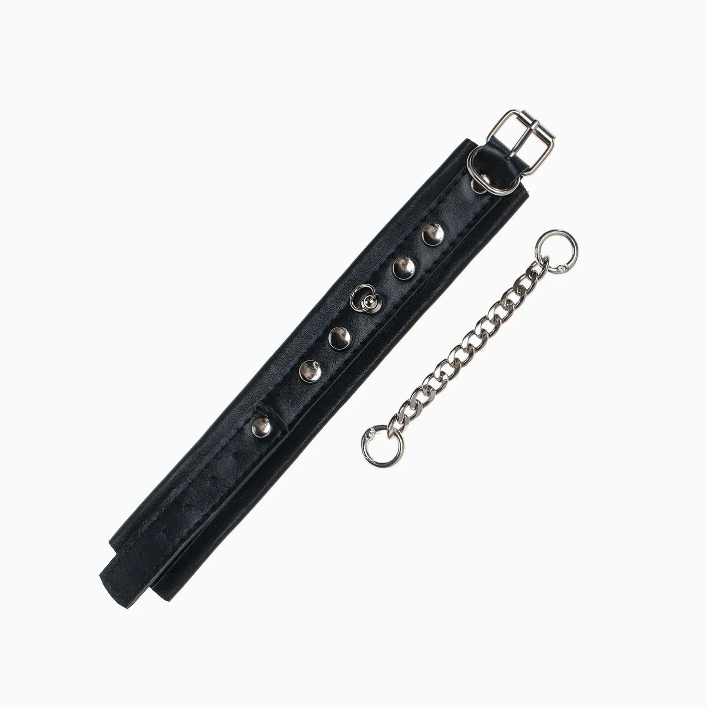 Наручники сделаны из кожи и декорированы металлическими заклёпками. Они соединены между собой металлической цепочкой на карабинах. Наручники регулируются по размеру ремешками с пряжками.