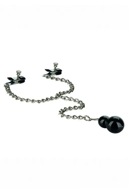 Weighted Dual Tier Nipple Clamps - регулируемые двухуровневые зажимы на соски в виде прищепок и с утяжелителем. Цепочка и зажимы изготовлены из железа. Кончики зажимов оснащены мягкими, удобными подушечками из ПВХ.