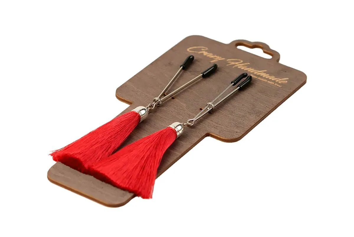 Зажимы-вилки на соски PinkRabbit с кисточками из шелка, красные