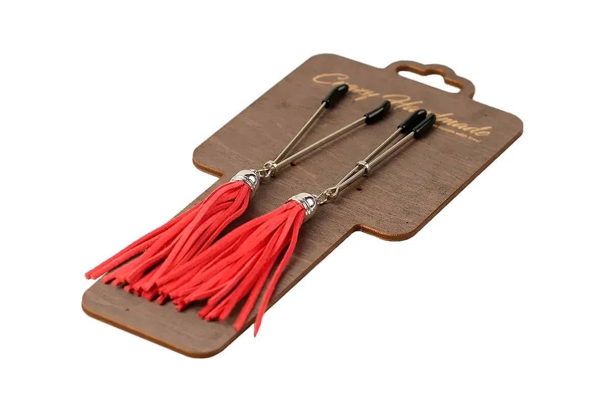 Зажимы-вилки на соски PinkRabbit с кисточками из замши, красные