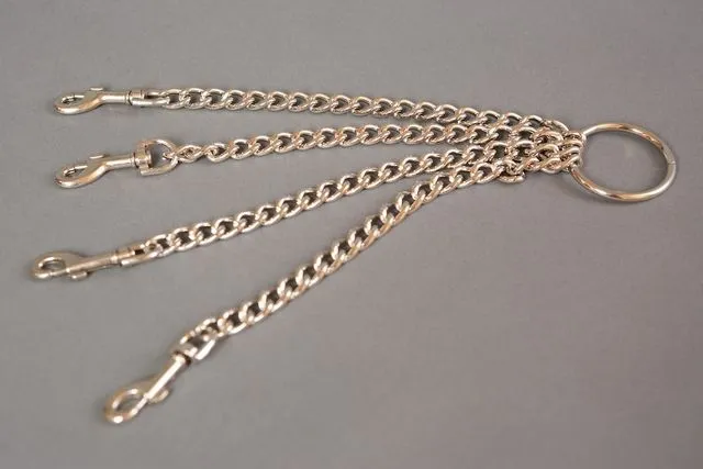 Цепь с центральным кольцом и четырьмя карабинами может использоваться для соединения наручников и поножей, а также других девайсов БДСМ-тематики. Она выполнена из прочного металла. Готовясь к жарким играм в стиле БДСМ, не стоит забывать о таких мелочах. Ведь надежное крепление имеет особое значение для комфорта и безопасности.