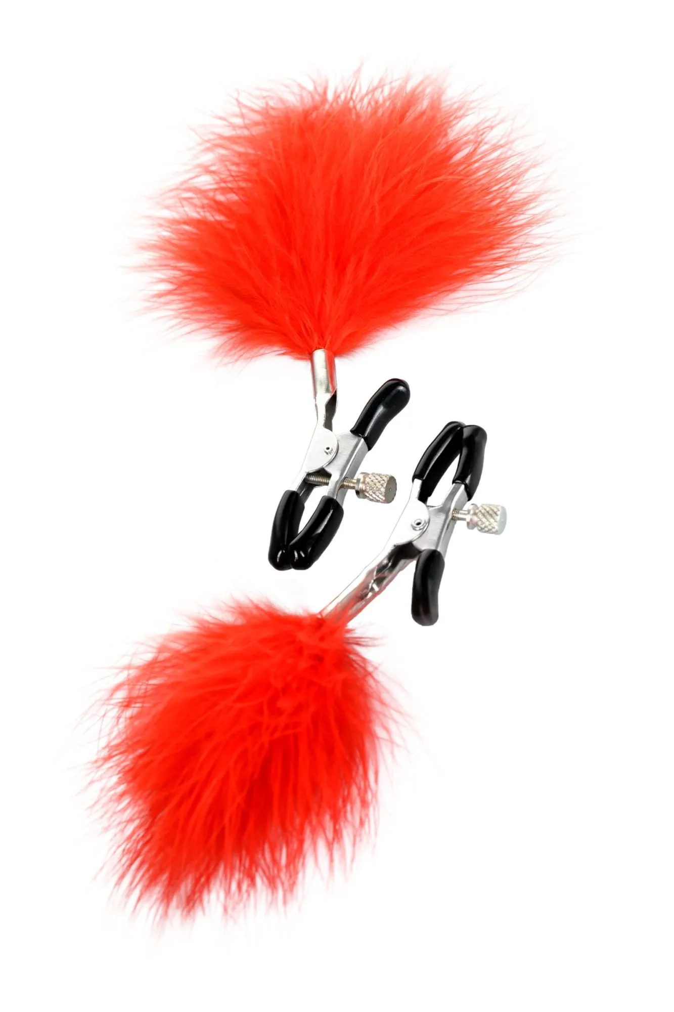 Пожалуй, самые милые из всех зажимов - украшенные перьями. Они стимулируют не только сжатием сосков, но и щекочут грудь. Сдавливание регулируется болтиком и может быть усилено или уменьшено во время интимной игры. Покрытие на концах зажимов защищает нежную кожу.