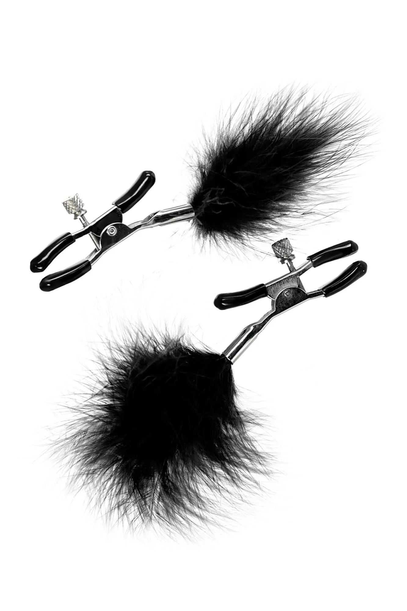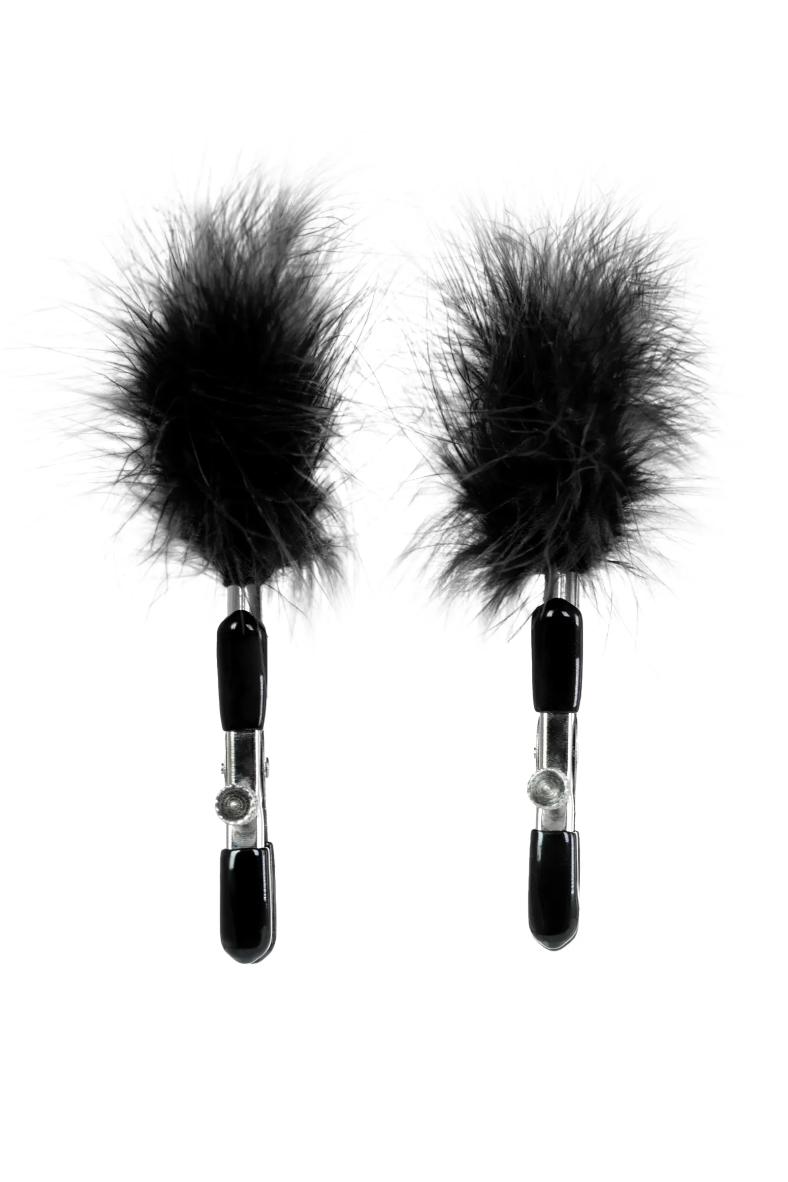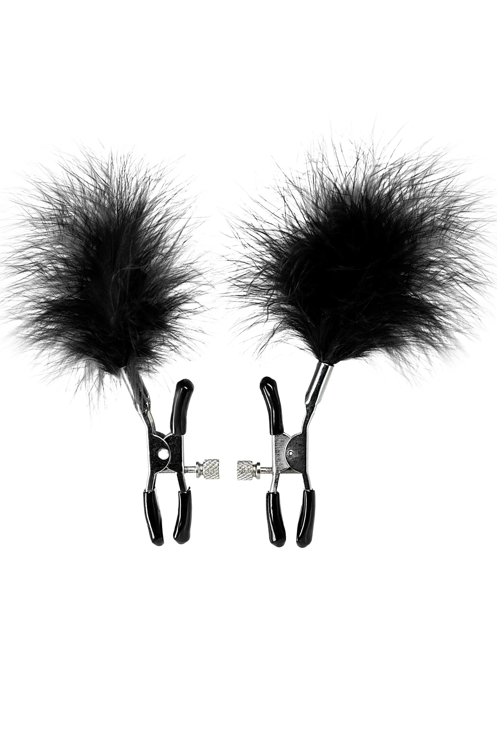 Пожалуй, самые милые из всех зажимов - украшенные перьями. Они стимулируют не только сжатием сосков, но и щекочут грудь. Сдавливание регулируется болтиком и может быть усилено или уменьшено во время интимной игры. Покрытие на концах зажимов защищает нежную кожу.