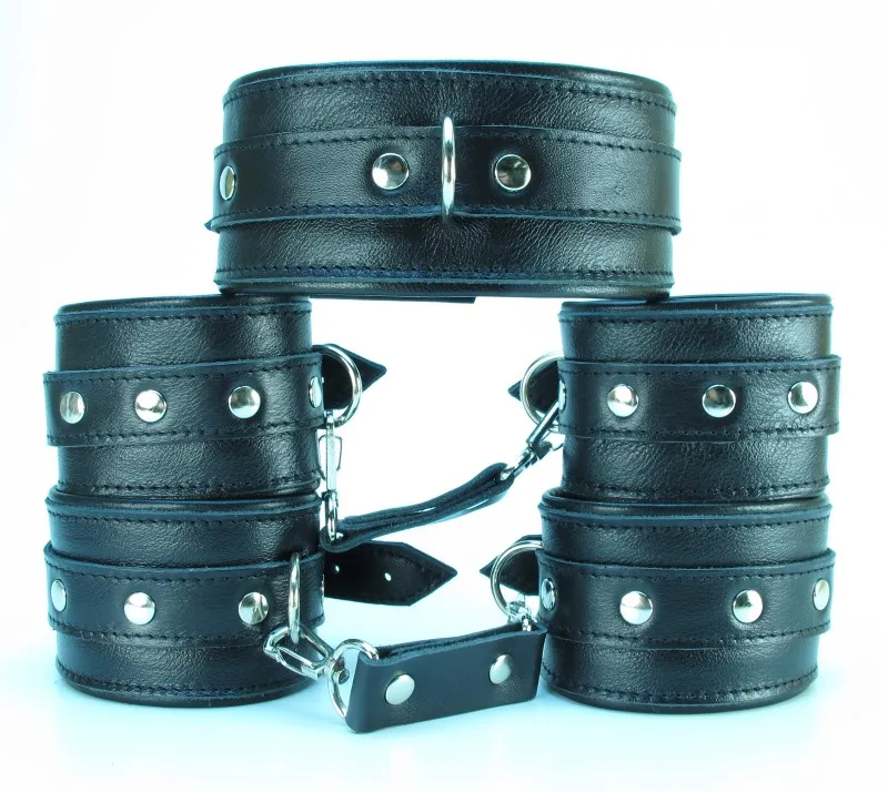 Набор аксессуаров, изготовленных из натуральной кожи. В него входят: наручники и поножи, украшенные заклепками (ширина — 5,7 см), которые можно соединять и комбинировать между собой при помощи прочных перемычек (длина 6 см) с карабинами (входят в комплект). Размер меняется при помощи застежки. Так же имеется ошейник, шириной 5,7 см, с одним кольцом. Размер регулируется застежками.  Модный интимный аксессуар не сдавливает и не нарушает кровообращение, так как изготовлен из мягкой кожи. Упаковка: картонная подложка.