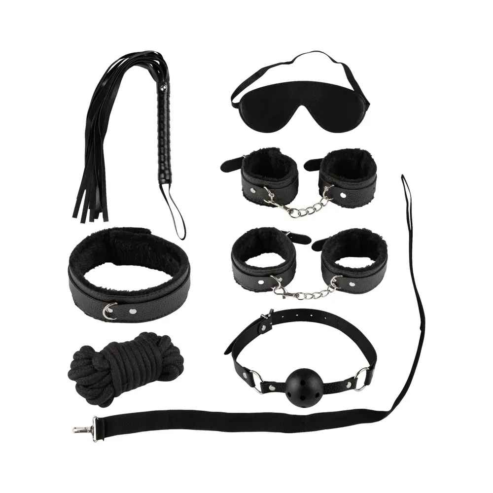 В набор входит: 2 пары кожанных наручников с мехом (для рук и ног), 1 ошейник кожанный с поводком, 1 кляп-шар, 1 маска для глаз, 1 плеть-флогер, 1 веревка для связывания. 7 предметов.