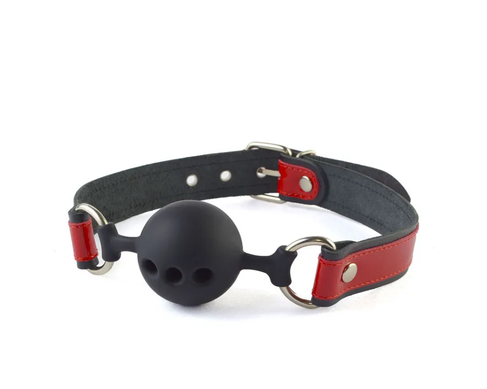 Силиконовый кляп-шар с ремешками из натуральной кожи черного цвета. Вдоль ремешков проходит лаковая кожаная накладка красного цвета. Регулируется девайс при помощи металлической пряжки. Металлическая фурнитура имеет никелевое покрытие.