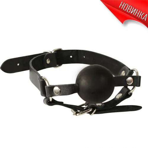 Кляп изготовлен из натуральной кожи черного цвета с никелированной фурнитурой. Диаметр шара 4,5 см, материал -ТПЕ. Размер регулируется ремешками.
