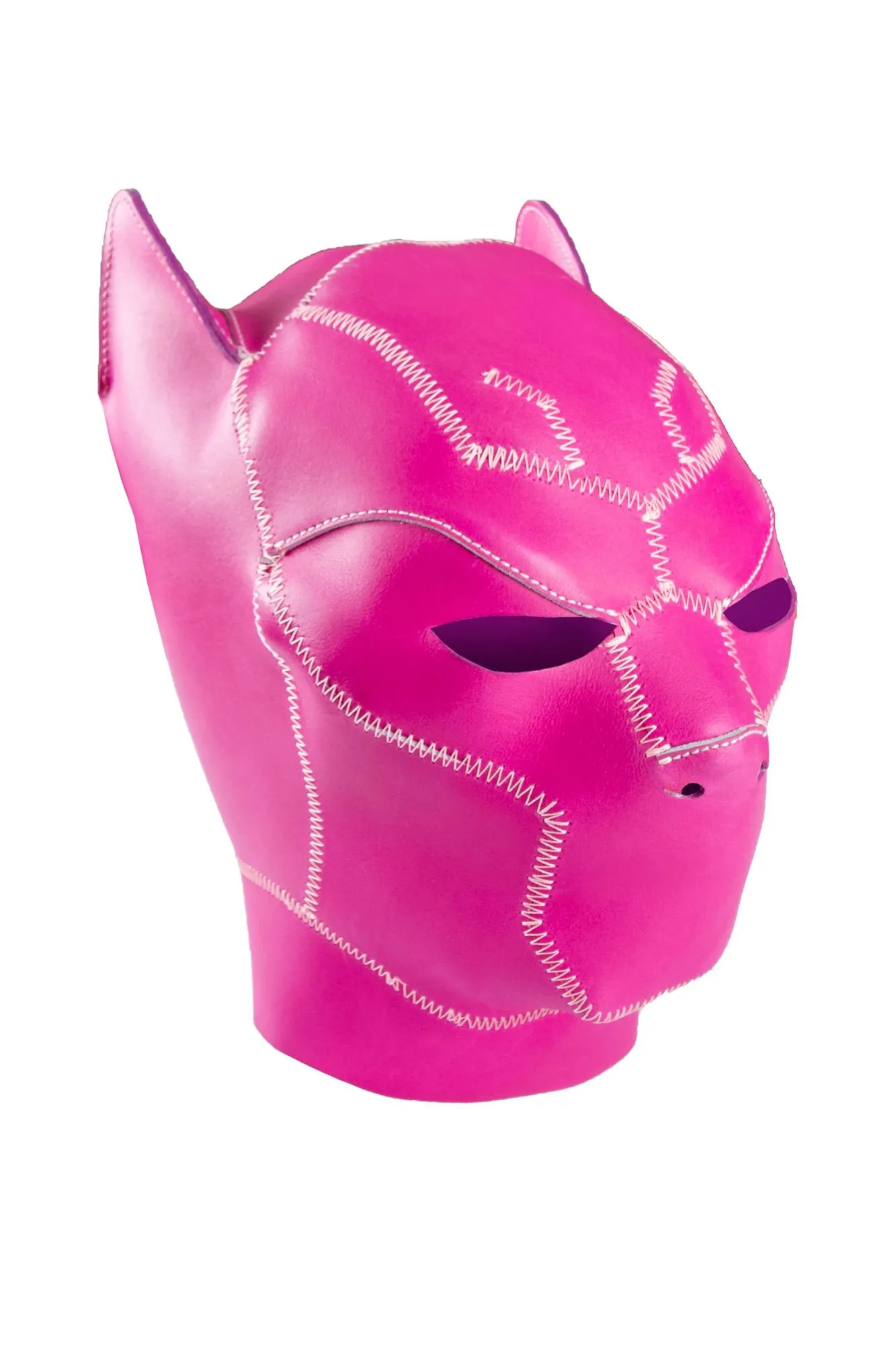 Женский шлем "Черная пантера" от бренда Beastly сделан из натуральной кожи розового цвета и оснащен длинной молнией на затылке. Он неподшитый и плотно садится на голову. У шлема есть прорези для глаз и только два небольших отверстия под носом, поэтому дыхание будет частично ограничено.