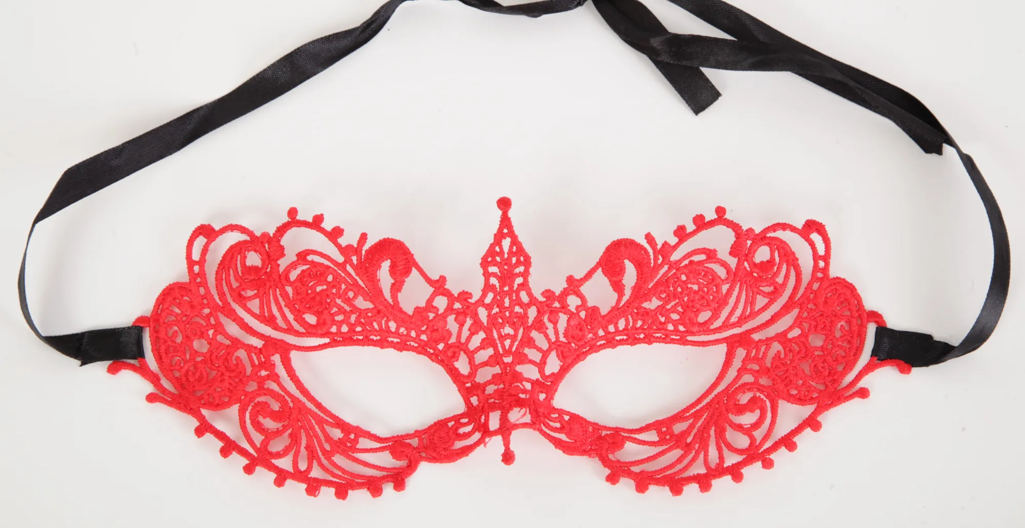 Красная кружевная маска в венецианском стиле с многочисленными узорами. Завязывается на черные атласные ленты. Размеры маски: длина- 20 см, ширина - 7,5 см. Упаковка- картонный конверт.