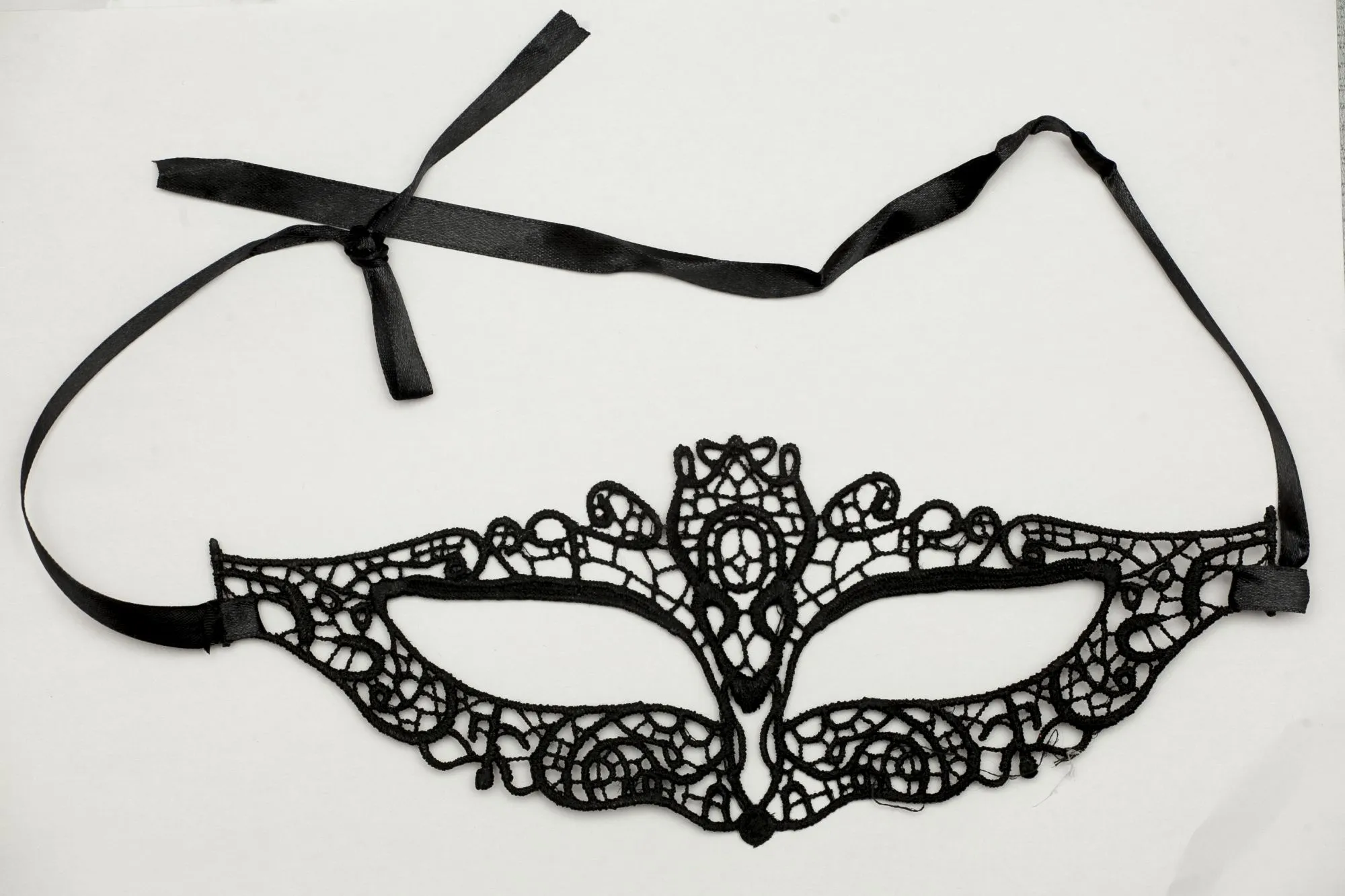 Кружевная маска в венецианском стиле с многочисленными ажурными узорами. Завязывается на атласные ленты. Размеры маски: длина- 22 см, ширина - 9 см. Упаковка- бумажный пакет.