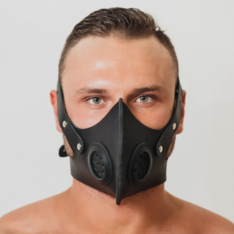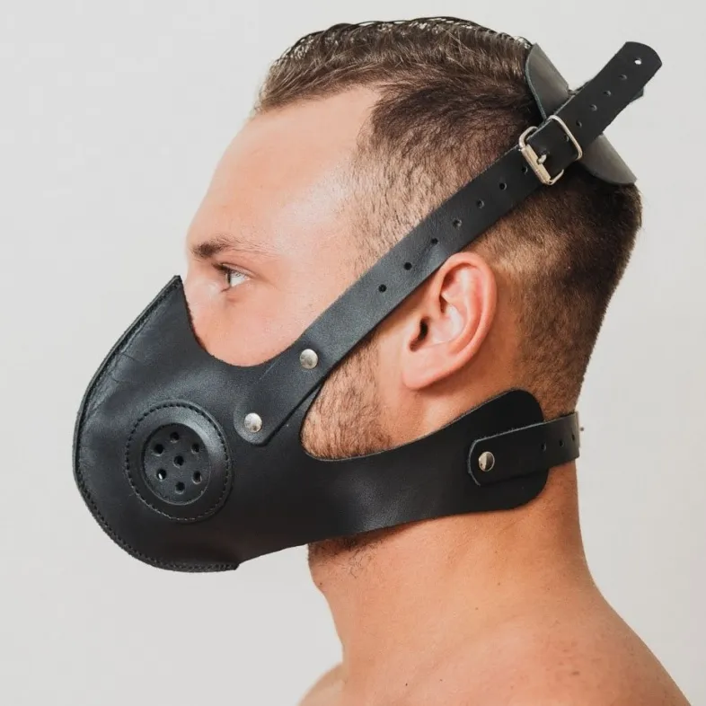Маска из натуральной кожи черного цвета со вставками по бокам, имитирующими фильтры противогаза, придающие образу соответствующий антураж. Маска надежно фиксируется на голове, отлично подходит для продолжительных ролевых игр.