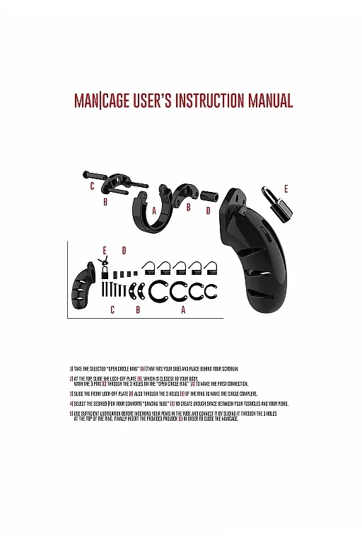 Благодаря мягкому высококачественному силикону пояс идеально подходит для долговременного ношения. Изделие состоит из нескольких разборных частей: клетки, кольца и штифтов, которые идеально сочетаются друг с другом. В комплекте к поясу идет 3 кольца разных диаметров для разных размеров и предпочтений. Просто выберете подходящий размер кольца, соедините его тремя штифтами, оденьте на средний штифт специальную втулку и соедините с клеткой. На центральном штифте есть специальное отверстие для замка. Выберете один из замков и зафиксируйте пояс. Фиксация тонкой гибкой лентой высокой прочности гарантирует, что металлоискатели на пояс не среагируют.