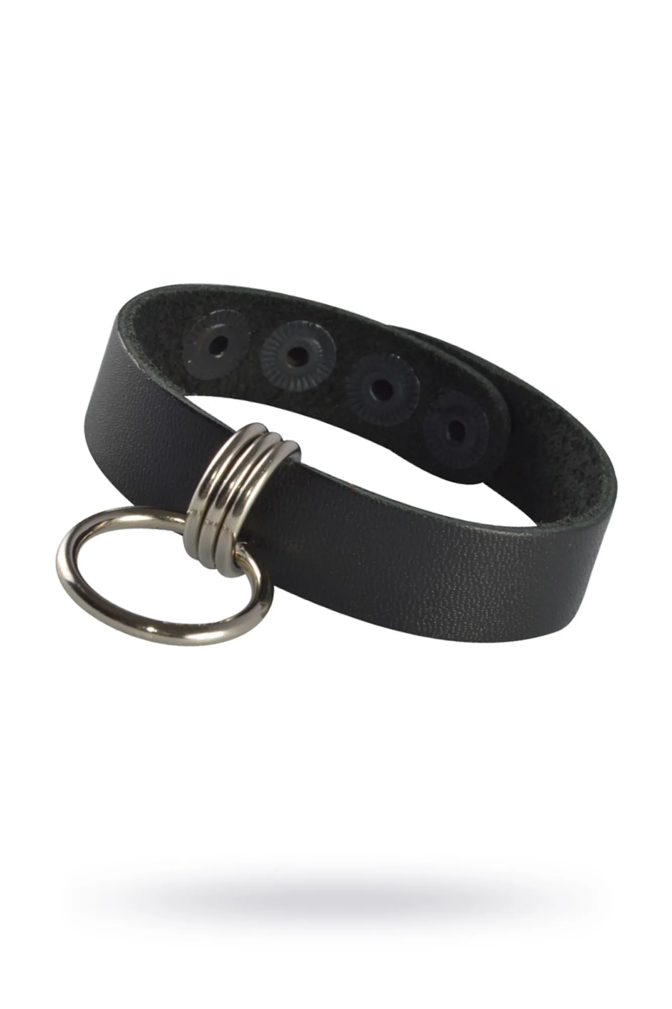 Браслет из натуральной кожи черного цвета, украшен подвесным металлическим кольцом. Регулируется при помощи кнопок. Длина браслета 21 см, ширина 1,5 см. Металлическое кольцо имеет никелевое покрытие.