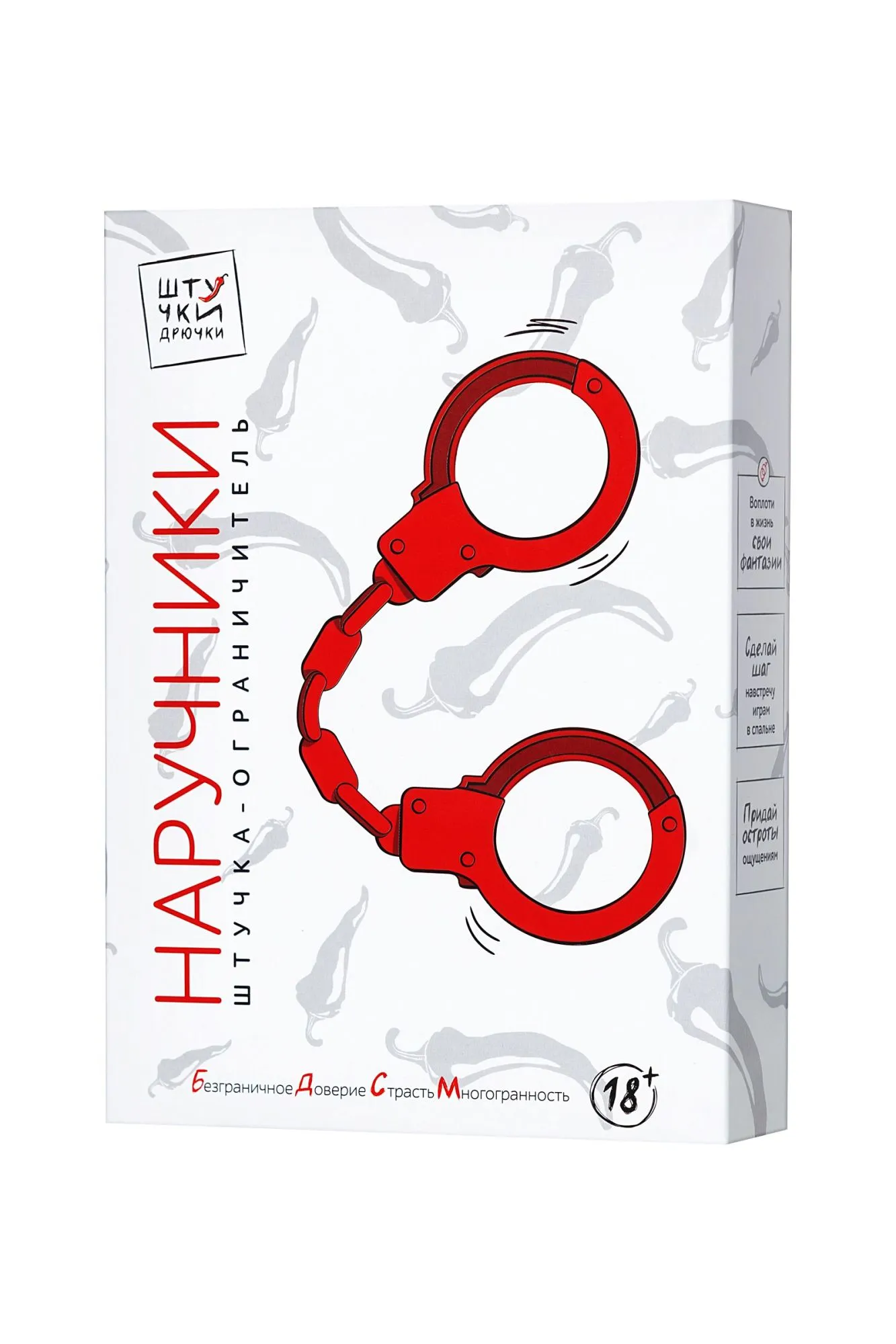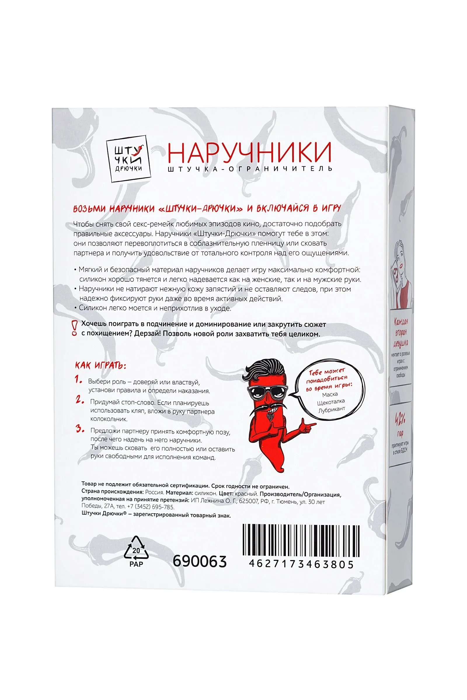Возьми наручники «Штучки-Дрючки» и включайся в игру. Чтобы снять свой секс-ремейк любимых эпизодов кино, достаточно подобрать правильные аксессуары. Наручники «Штучки-Дрючки» помогут тебе в этом: они позволяют перевоплотиться в соблазнительную пленницу или сковать партнера и получить удовольствие от тотального контроля над его ощущениями. Мягкий и безопасный материал наручников делает игру максимально комфортной: силикон хорошо тянется и легко надевается как на женские, так и на мужские руки. Наручники не натирают нежную кожу запястий и не оставляют следов, при этом надежно фиксируют руки даже во время активных действий. Силикон легко моется и неприхотлив в уходе. Хочешь поиграть в подчинение и доминирование или закрутить сюжет с похищением? Дерзай! Позволь новой роли захватить тебя целиком.