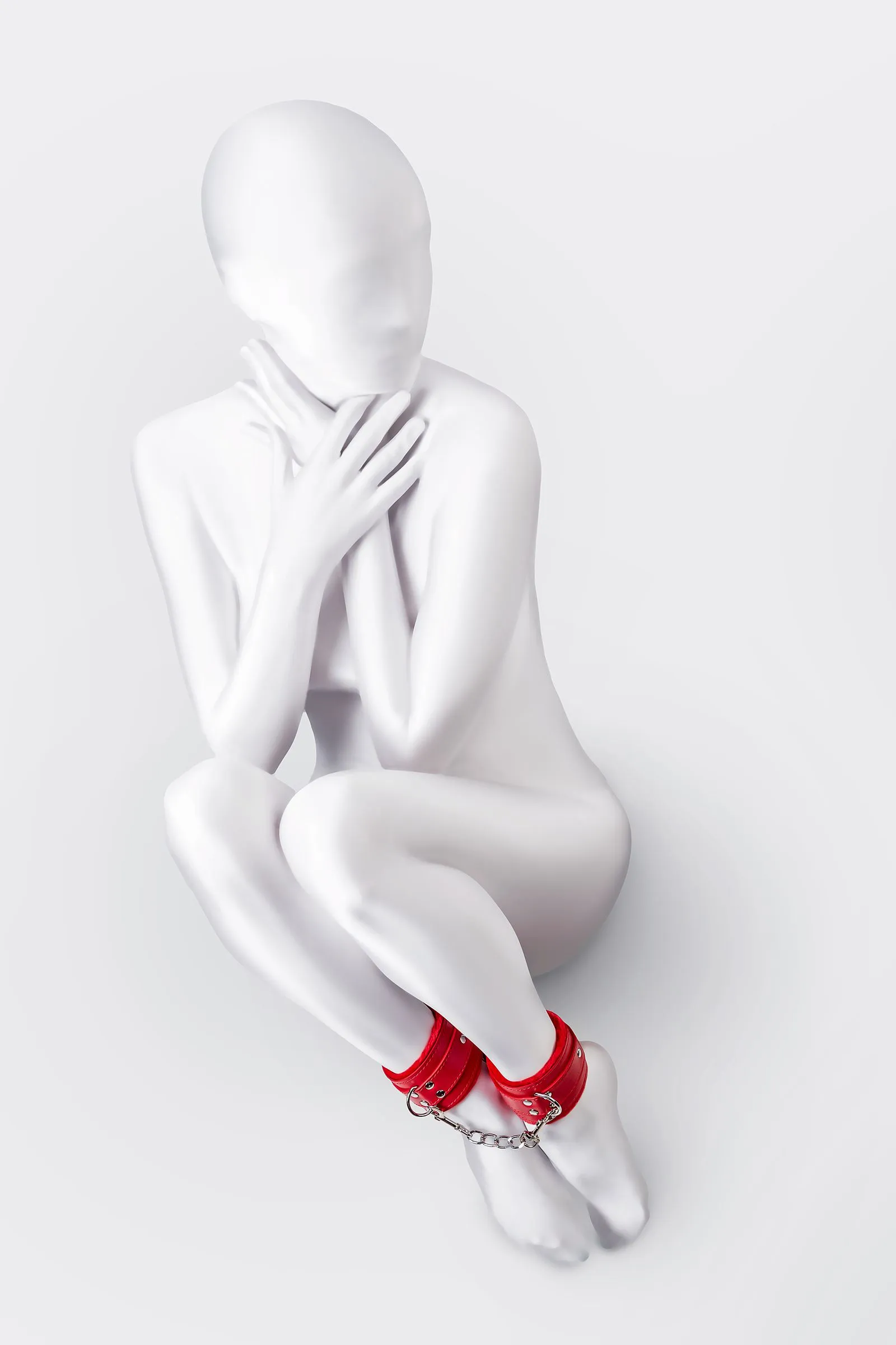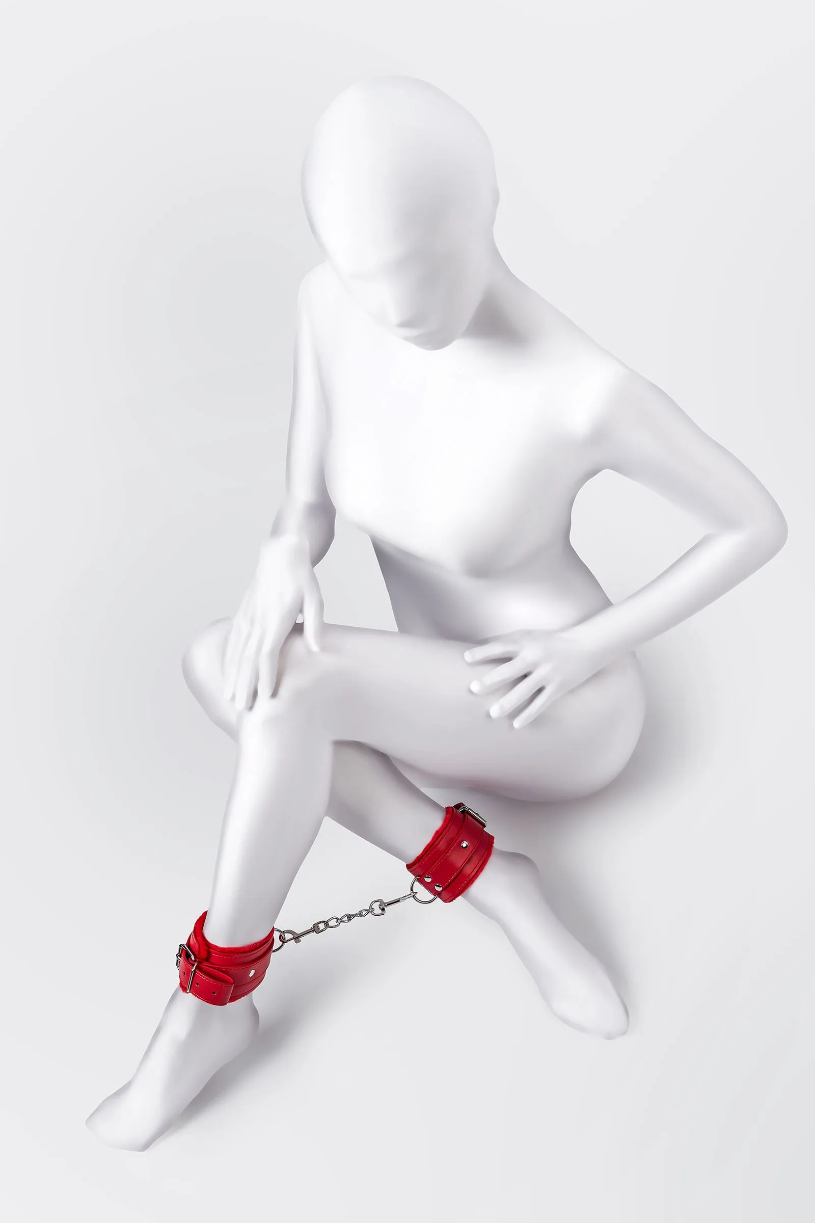 Оковы на ноги яркого красного цвета с металлической отделкой говорят вовсе не об агрессии. Эти произведения искусства говорят о страсти, которую можно проявить, но только с разрешения Доминанта. Подклад из искусственного меха делает ношение этих оков более комфортным, но расслабиться в них не получится – цепочка на карабинах сильно ограничивает свободу действий. Длина поножей позволяет использовать их практически на любой размер ног. Отрегулировать размер и силу обхвата легко с помощью ремешка и металлической пряжки. Оковы – классический предмет для игры в подчинение, обязательный для начинающих и опытных поклонников БДСМ. Дополните комплект аксессуарами - ошейником, кляпом, наручниками и продемонстрируйте что значит грубое обращение и полный контроль над свободой. Материал: PU кожа, металл Цвет: красный Длина: 27 см Ширина: 5,5 см Длина сцепки: 15,5 см