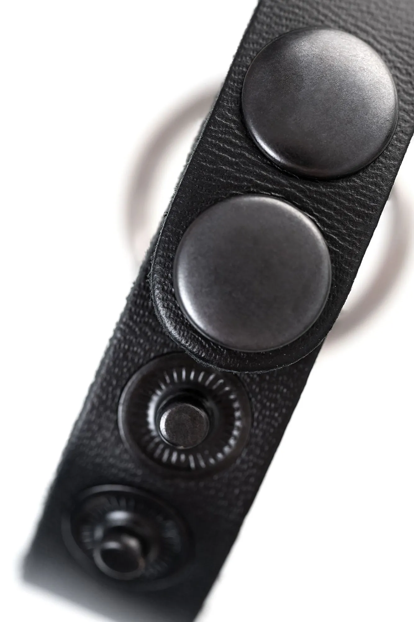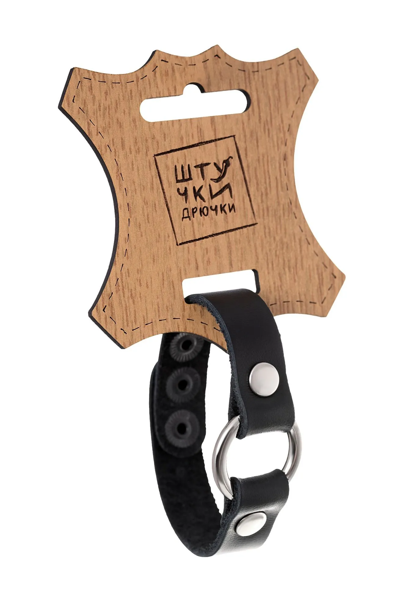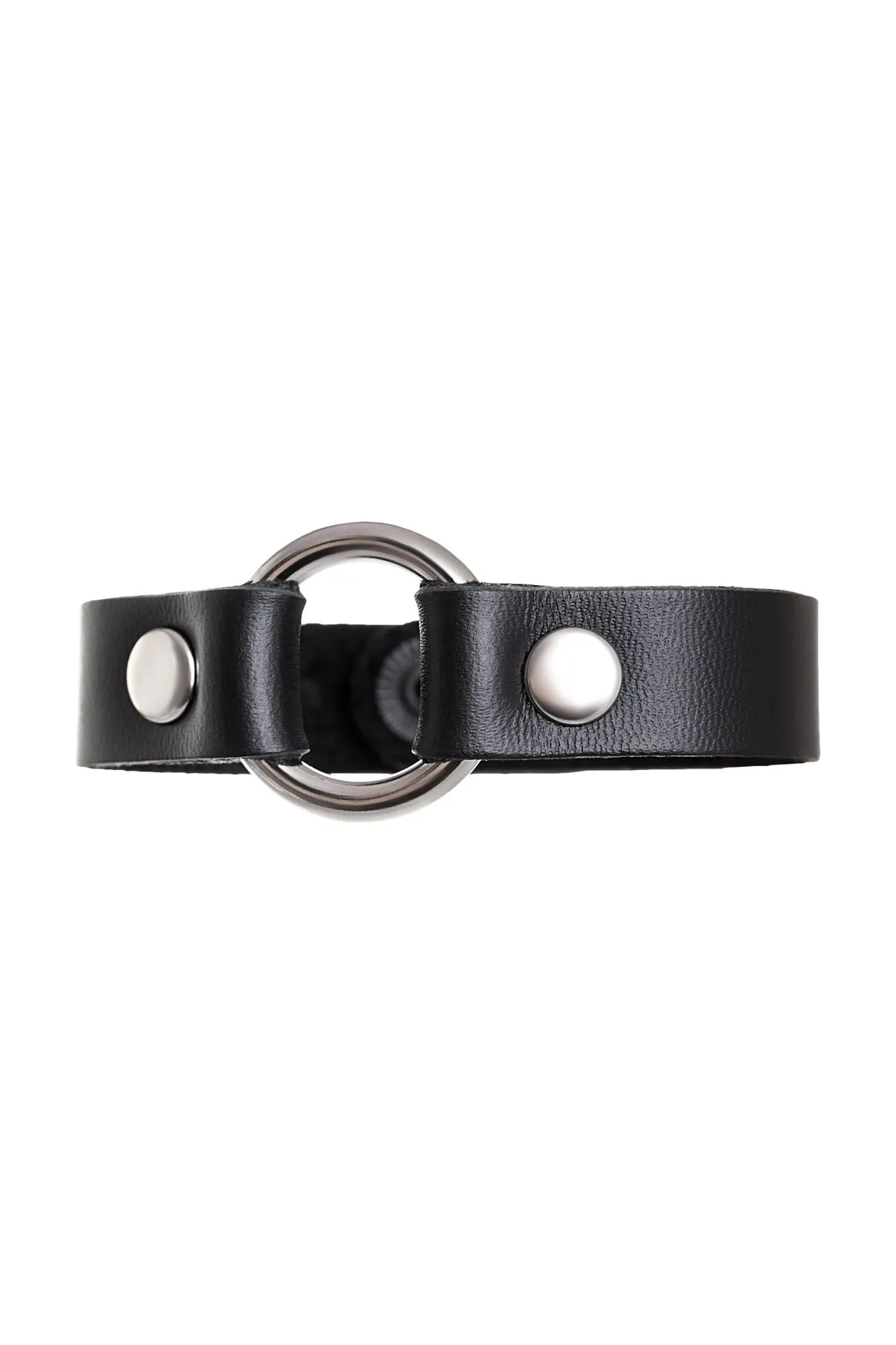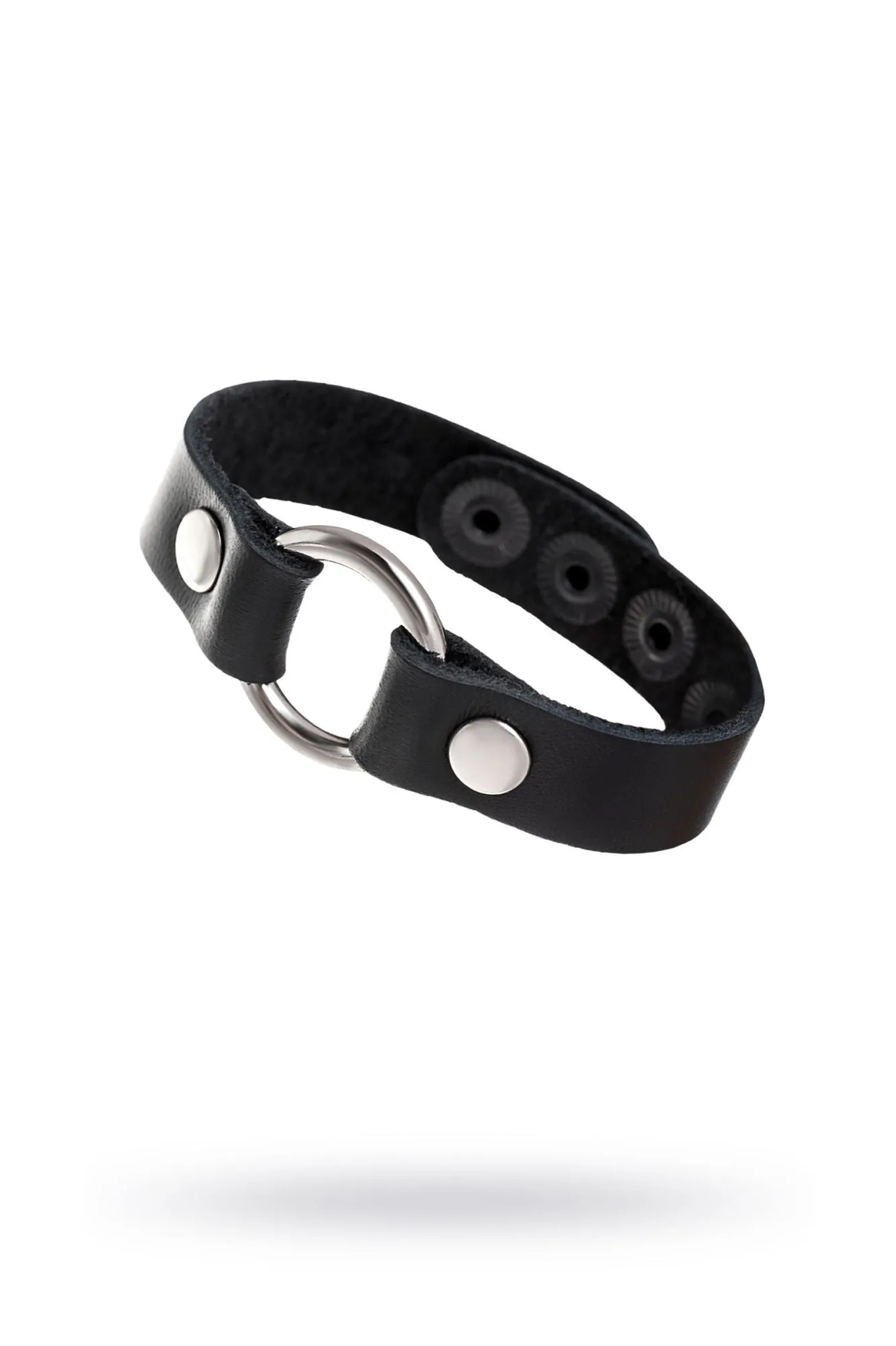 Браслет из натуральной кожи черного цвета украшен металлическим кольцом. Регулируется при помощи кнопок. Длина браслета 21 см, ширина 1,5 см. Металлическое кольцо имеет никелевое покрытие. Масса нетто 10 гр.
