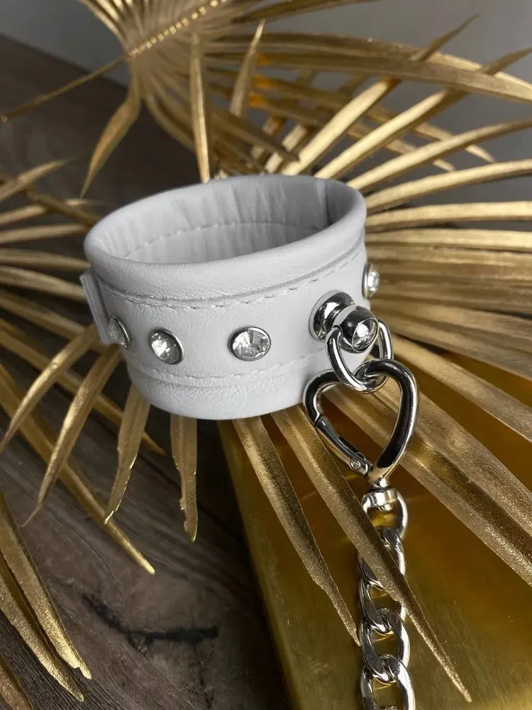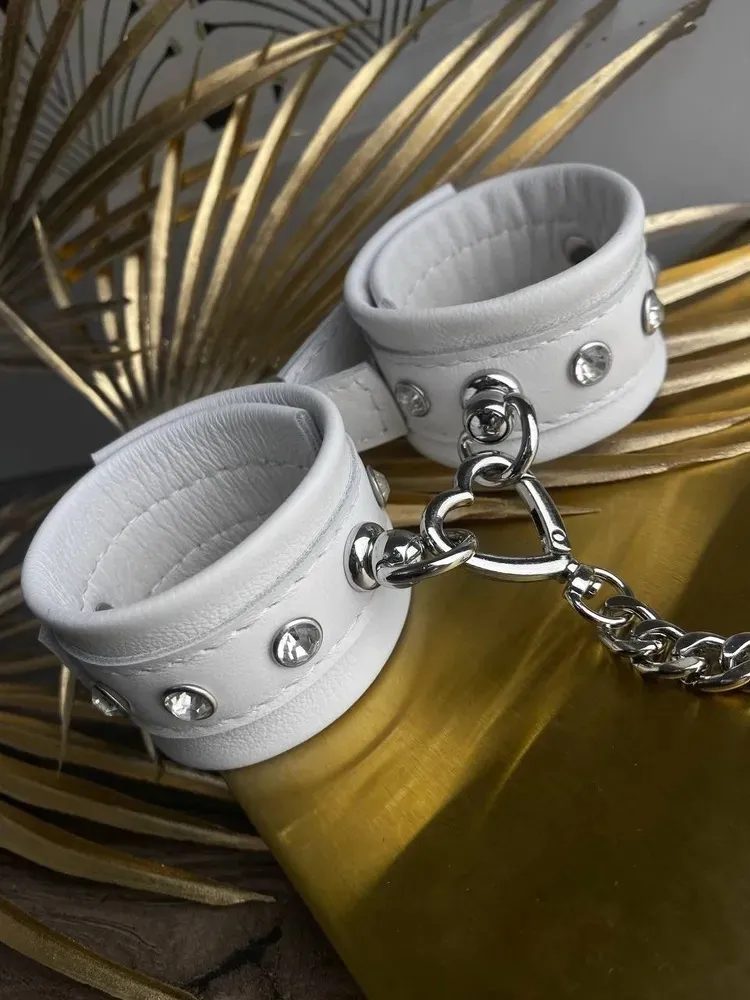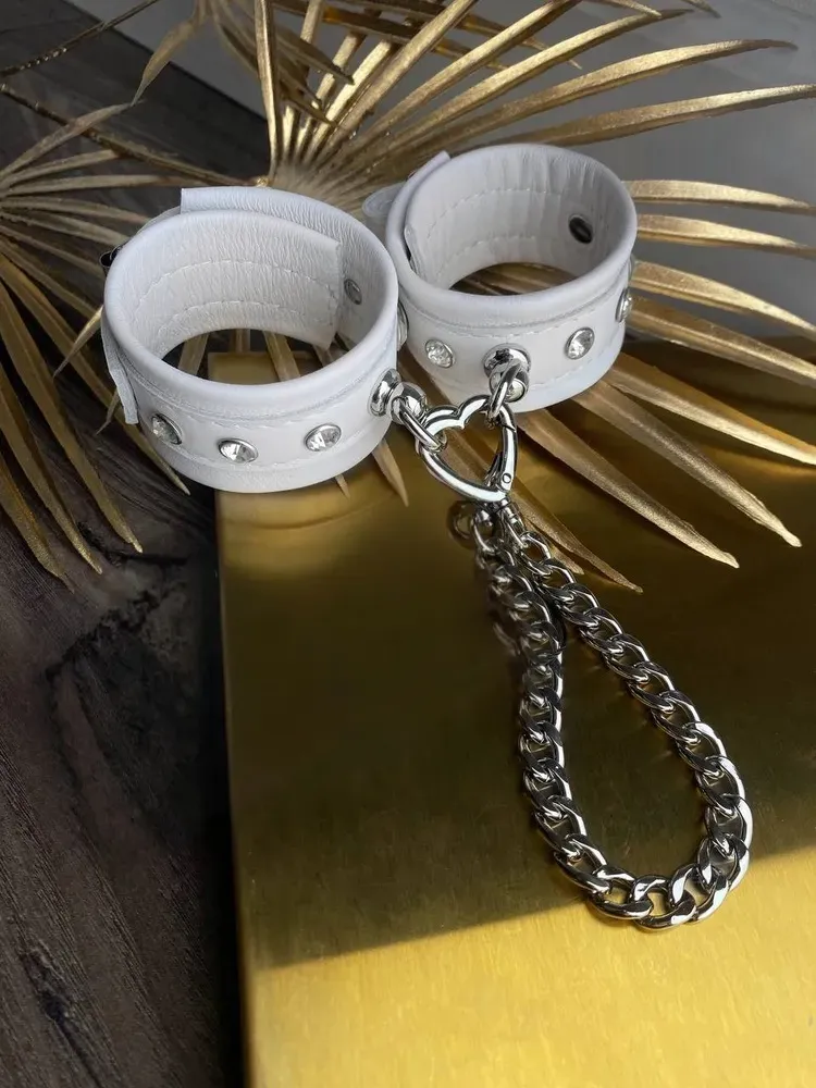 Теперь Вы можете быть уверены, что Ваш пленник не сбежит от Вас, если Вы обездвижите его с помощью этого БДСМ-аксессуара. Белые наручники декорированы металлическими клепками и соединены между собой при помощи цепочки. Ремешки с пряжками позволяют отрегулировать диаметр оков. Привнесите в Ваши интимные отношения немного разнообразия с помощью этого приспособления для сексуальных утех.