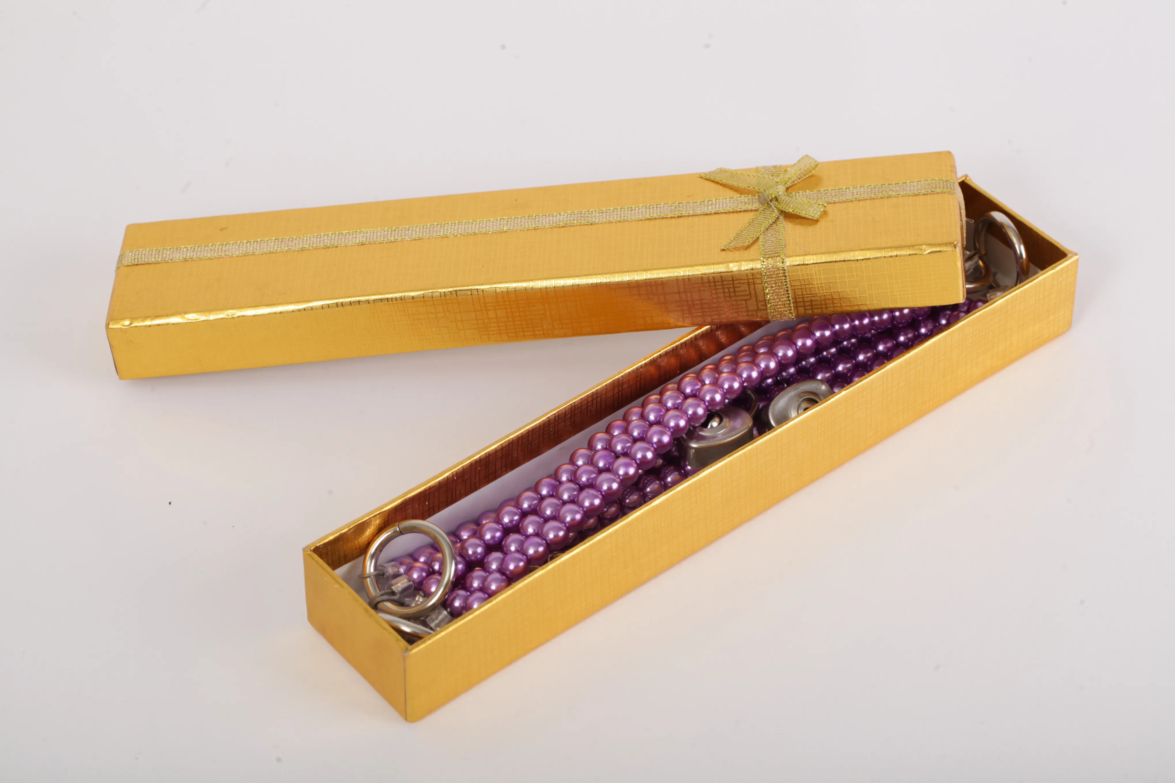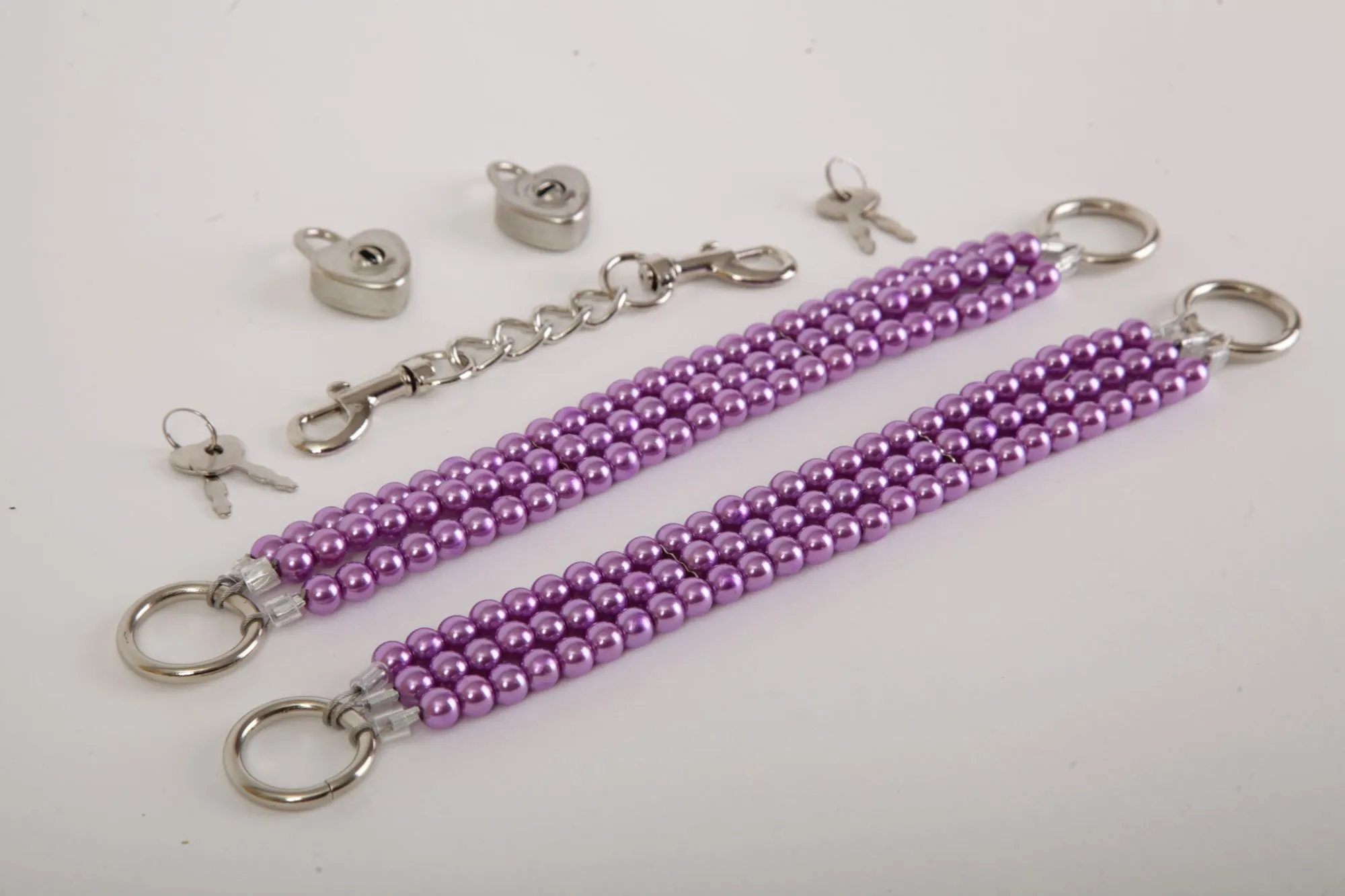 Красивые наножники из сиреневого жемчуга с замочками в виде сердца  и четырьмя ключиками. Чтобы ограничивать движения есть небольшая цепочка с двумя карабинами. Характеристики: длина наножника- 26см, ширина-2,5см, длина цепочки- 13см. Упаковка- картонная золотая коробка с бантиком.