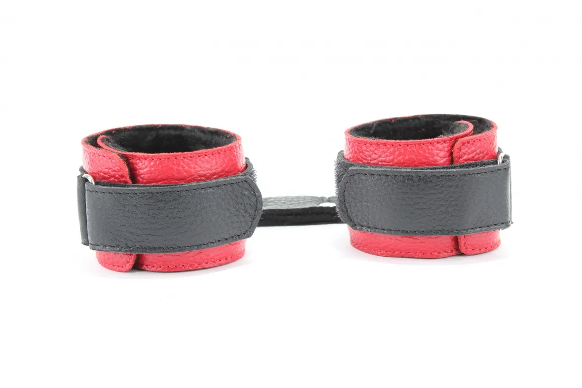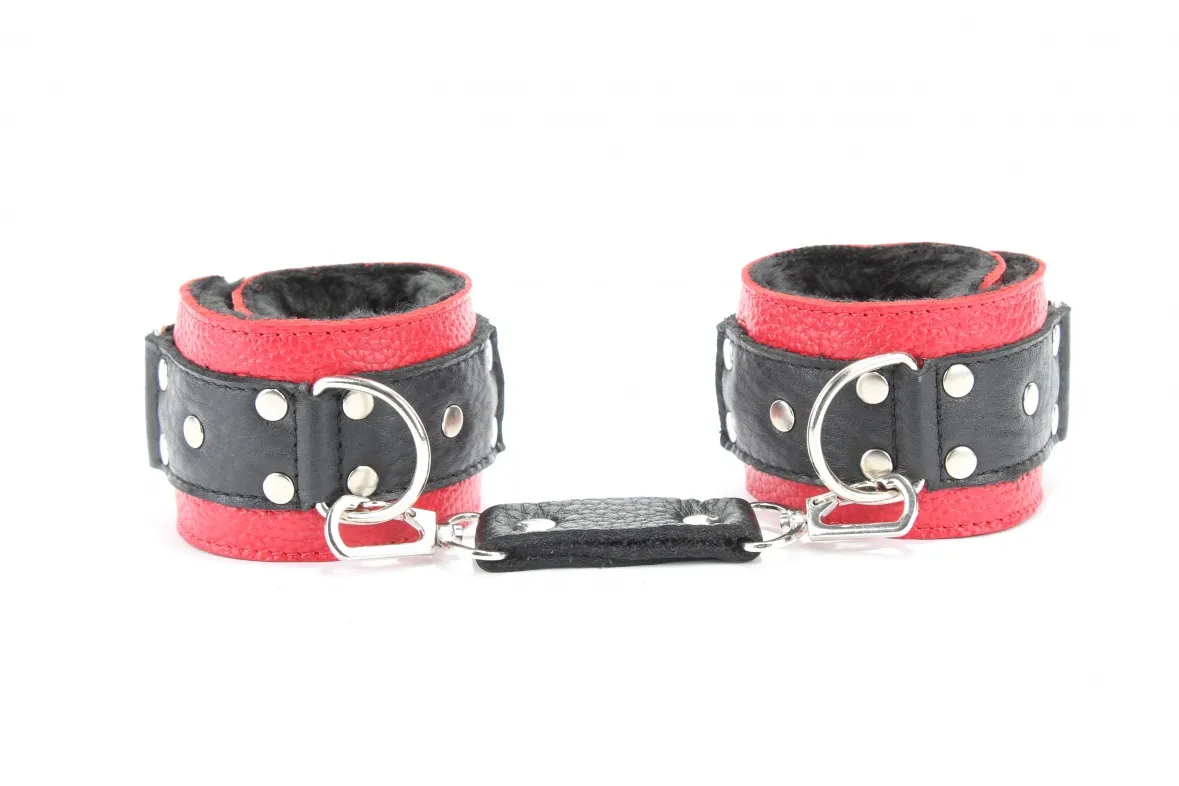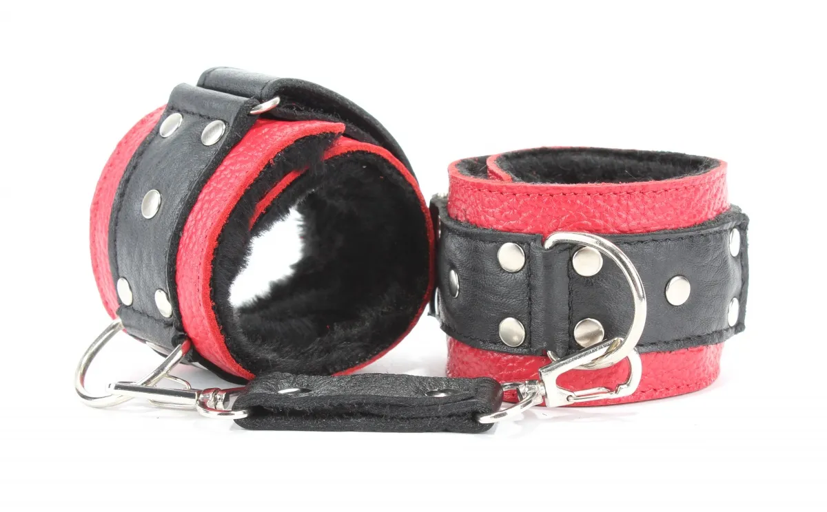 Кожаные наручники красного цвета.Ширина - 5 см. Украшены заклепками и соединяются между собой цепью с карабинами (длина цепочки - 15,5 см). Имеет вставку черного цвета на лицевой части и отделаны мехом с внутренней части.Размер наручников регулируется при помощи застежки-липучки