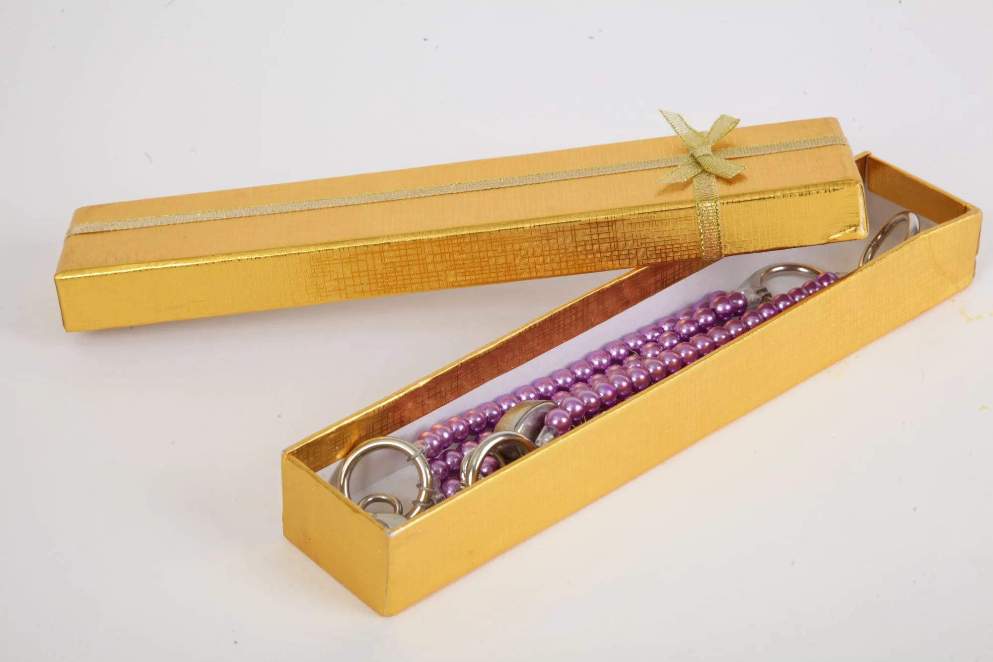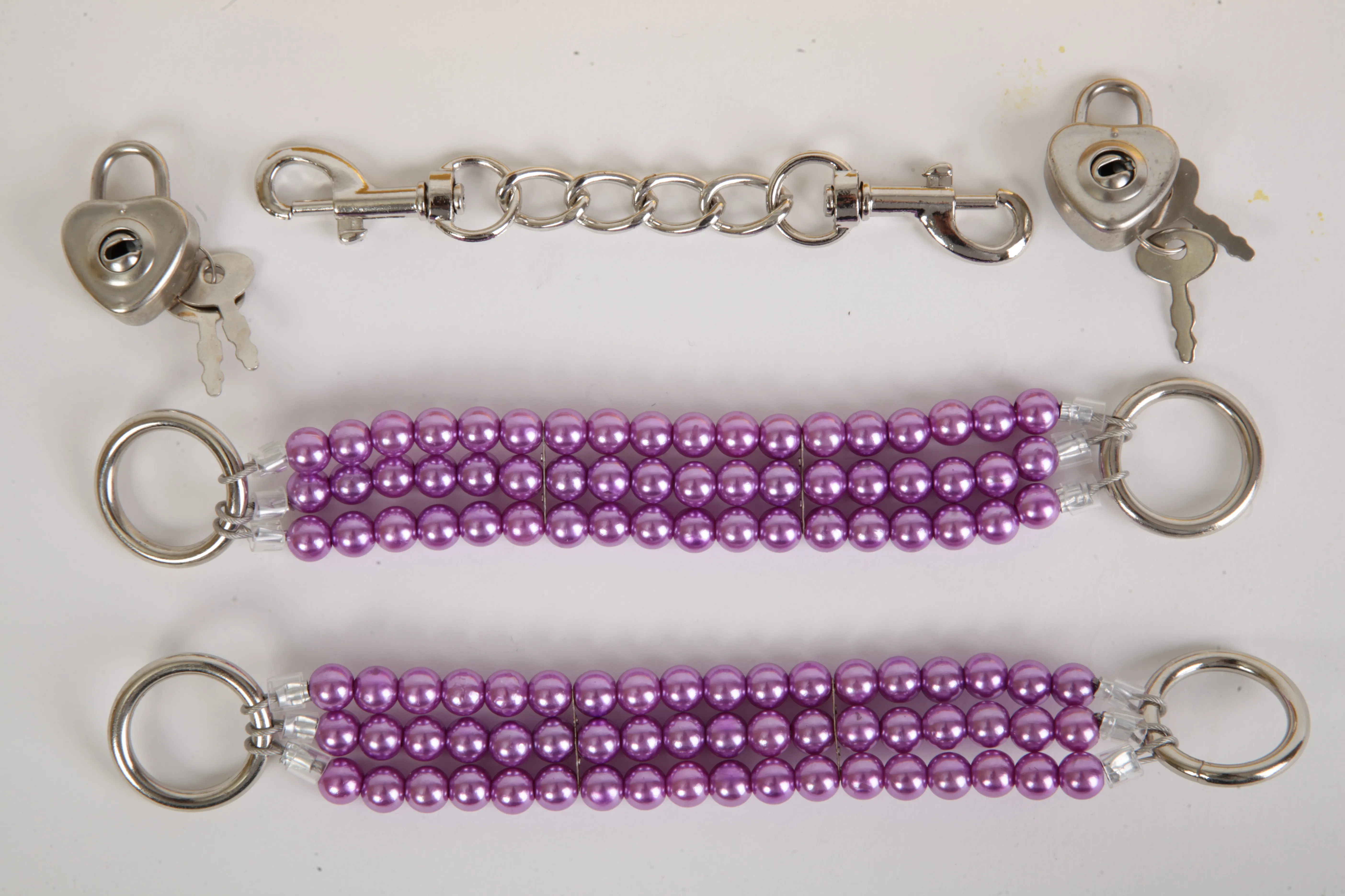 Сиреневые наручники с тремя нитями из жемчуга. Закрываются на замочки в виде сердечек с индивидуальными ключиками. Наручники можно соединить небольшой цепочкой с карабинами (длина- 13 см). Длина наручников- 20 см, ширина- 2,5 см. Упаковка- золотая подарочная коробка с бантом.