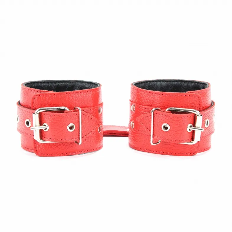 Оживить эротические игры Вам помогут наручники. Этот интимный аксессуар пользуется успехом у мужчин. Выполненные в красном наручники с пряжкой украшены прочными ремешками. Модный интимный аксессуар не сдавливает и не нарушает кровообращение, так как изготовлен из мягкой кожи. Чтобы любимая никуда не убежала, наручники соединены короткой цепочкой. Ширина оков - 6 см, длина цепочки – 12 см, производитель – BDSM Арсенал (Россия).