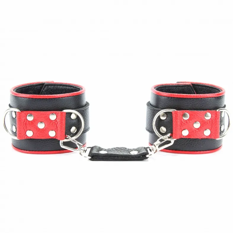 Сильные наручники в красно-черном цвете.Ширина - 6 см. Украшены заклепками и соединяются между собой цепью с карабинами (длина цепочки - 13см) Размер наручников регулируется при помощи застежки.