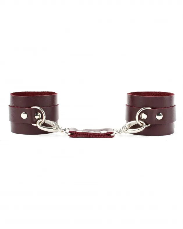 Оковы выполнены из натуральной кожи бордового цвета. Металлическая пряжка крепко удерживает в подчинении, кожаное соединение на карабинах фиксирует наручники вместе, ремни позволяю выбрать нужный размер. Стильный аксессуар поможет воплотить эротические фантазии в реальность.