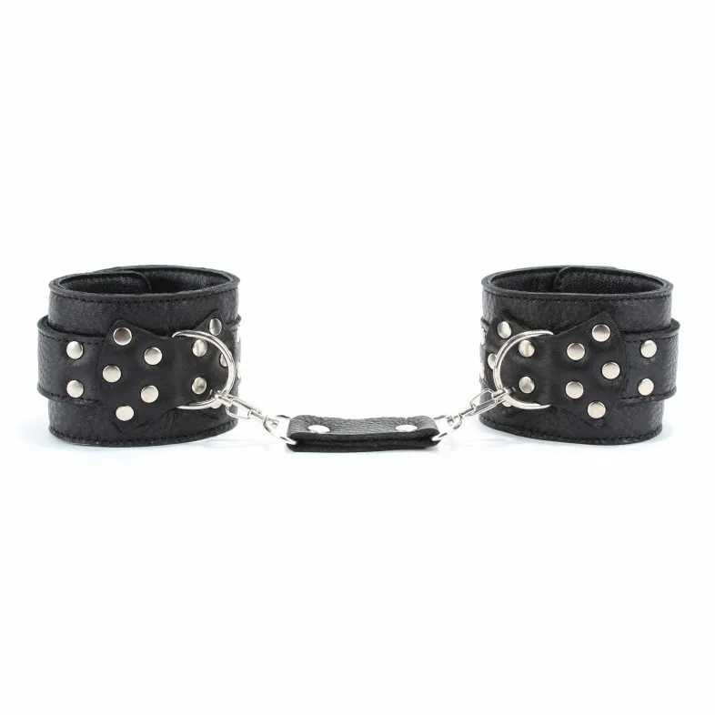 Кожаные наручники черного цвета.Ширина - 6 см. Украшены заклепками и соединяются между собой цепью с карабинами (длина цепочки - 15,5 см) Размер наручников регулируется при помощи застежки