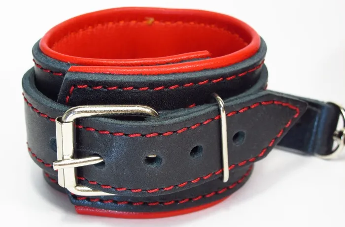 Оковы на ноги с красным подкладом. Выполнены из толстой ременной кожи черного цвета, подклад мягкая перчаточная кожа ярко красного цвета. На пряжке. Использована усиленная металлическая фурнитура. Строчка толстой ниткой контрастного красного цвета.
