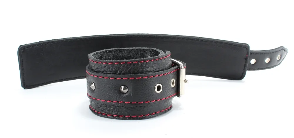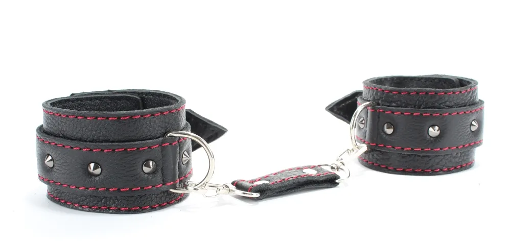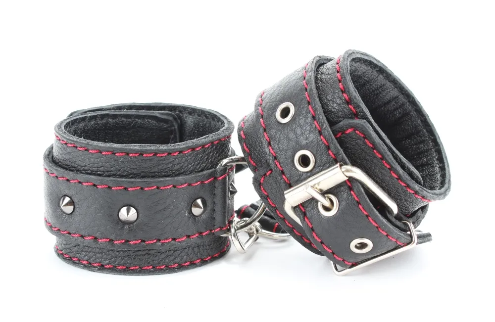 Оживить эротические игры Вам помогут поножи. Этот интимный аксессуар пользуется успехом. Выполненные в черном цвете с красной строчкой и украшены шипами. Модный интимный аксессуар не сдавливает и не нарушает кровообращение, так как изготовлен из мягкой кожи. Чтобы любимая никуда не убежала, поножи соединены короткой перемычкой. Ширина оков - 5,3см, длина оков- 26 см, длина перемычки – 6 см. Упаковка: картонная подложка.