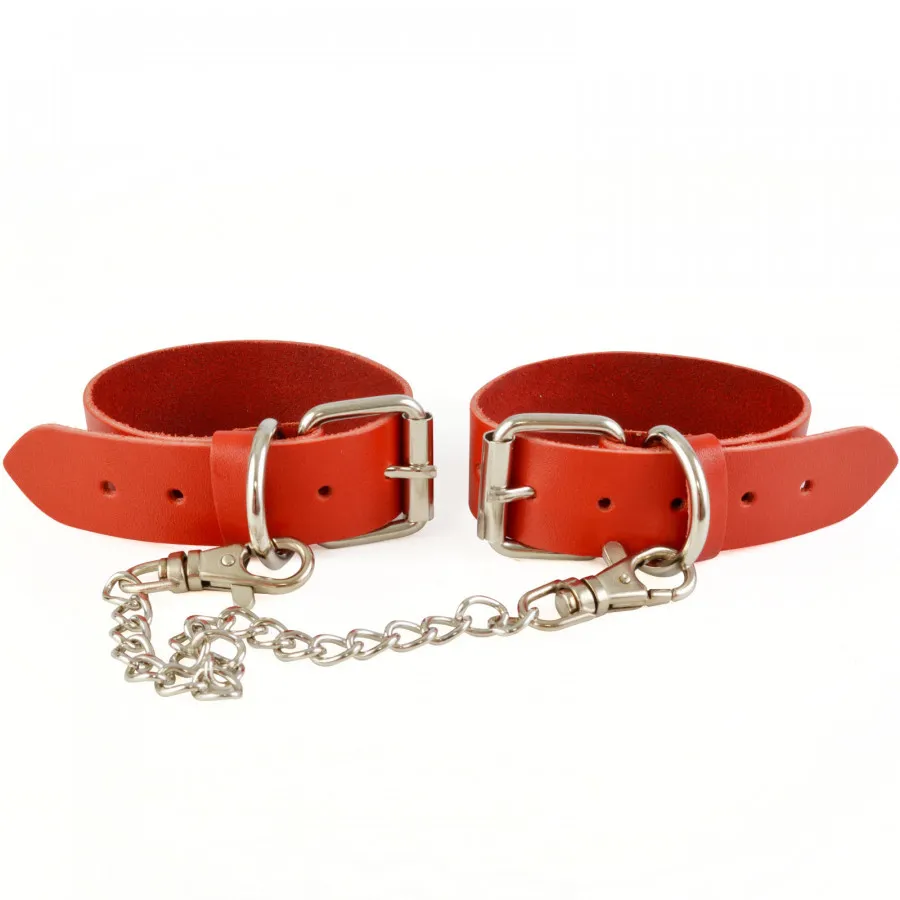 Оковы изготовлены из натуральной кожи алого цвета. Регулируются пряжкой, имею цепочку с карабинам, длина - 24см. Ширина браслета 2,5см. Обхват минимальный 19см, максимальный 26см. Длина упаковки 16, ширина 10, высота 8 см. Вес брутто 100 г.
