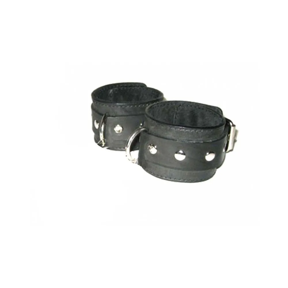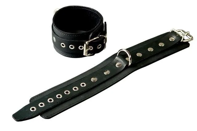 Этот БДСМ-аксессуар отлично разнообразит Ваши любовные игры и добавит в них немного остроты. С его помощью Вы надежно зафиксируете и обездвижите Вашего партнера. Черные поножи из натуральной кожи, декорированные металлическими клепками, можно регулировать по размеру с помощью пряжек. На поножах также есть D-образные крепления для присоединения других бондажных аксессуаров. Они удобно сидят на ноге, не травмируют и не доставляют неудобств.