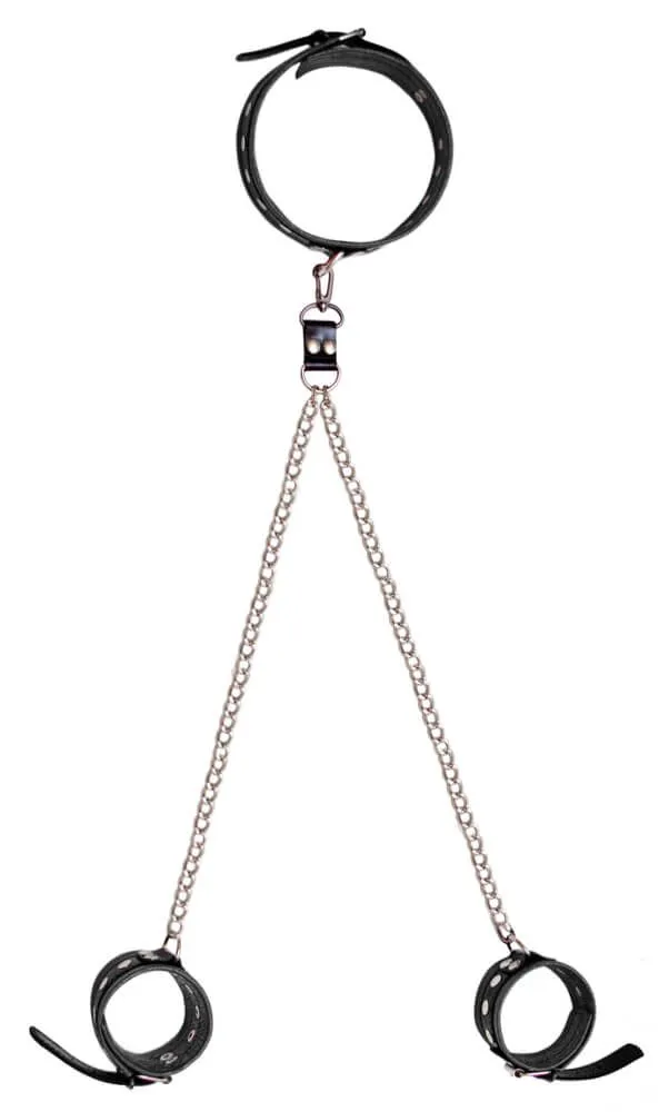 Комплект из ошейника и наручников сделан из натуральной кожи и декорирован металлическими клепками. Аксессуары соединены между собой при помощи отстегивающейся металлической цепочки. Все изделия регулируются по размеру при помощи ремешка с пряжкой. При помощи такого набора можно прочно зафиксировать партнера, не доставляя ему неудобств. Вы сможете ласкать своего партнера как угодно, не встречая сопротивления, а он, в свою очередь, будет более остро ощущать каждое прикосновение. Данная модель является уменьшенной версией похожих ошейника и наручников.