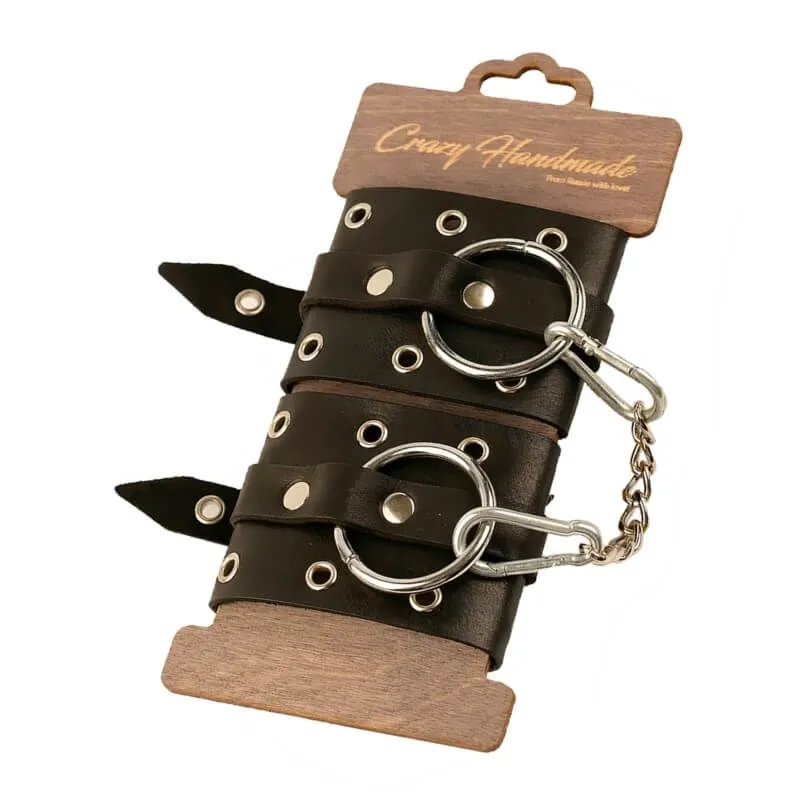 Однослойные наручники от бренда Pink Rabbit выполнены из натуральной кожи черного цвета и декорированы люверсами. К широким металлическим кольцам на оковах можно присоединить и другие аксессуары при помощи карабинов. Наручники регулируются по размеру при помощи ремешка с пряжкой.