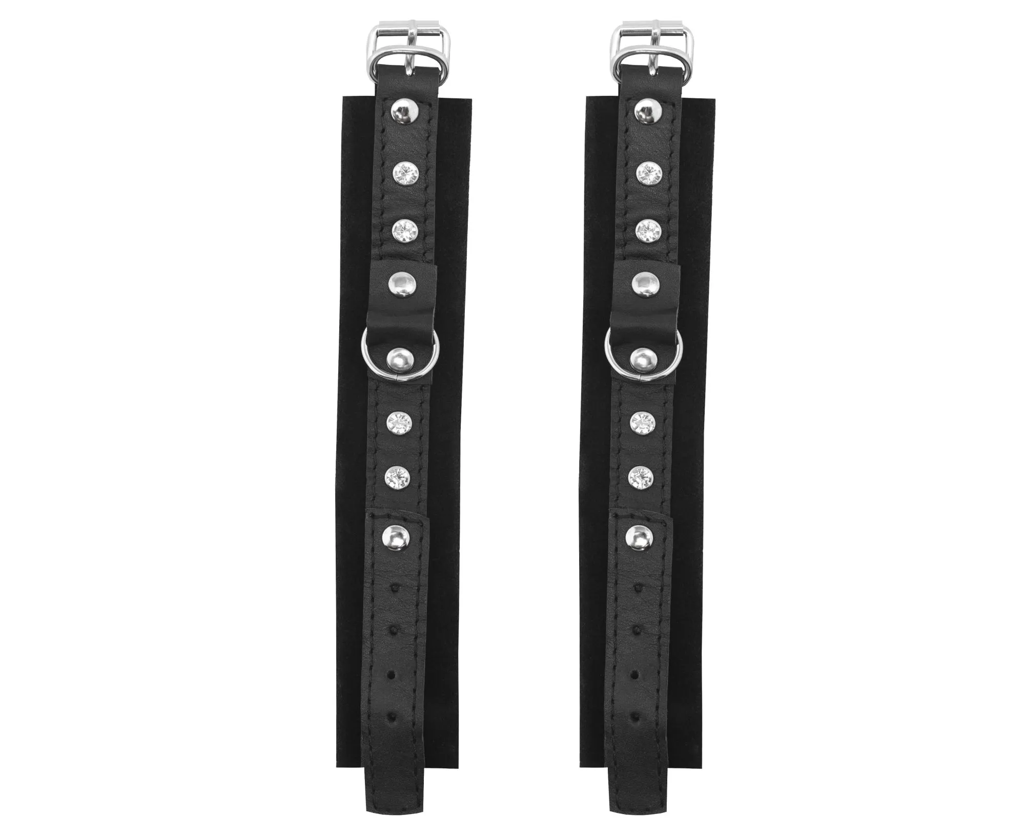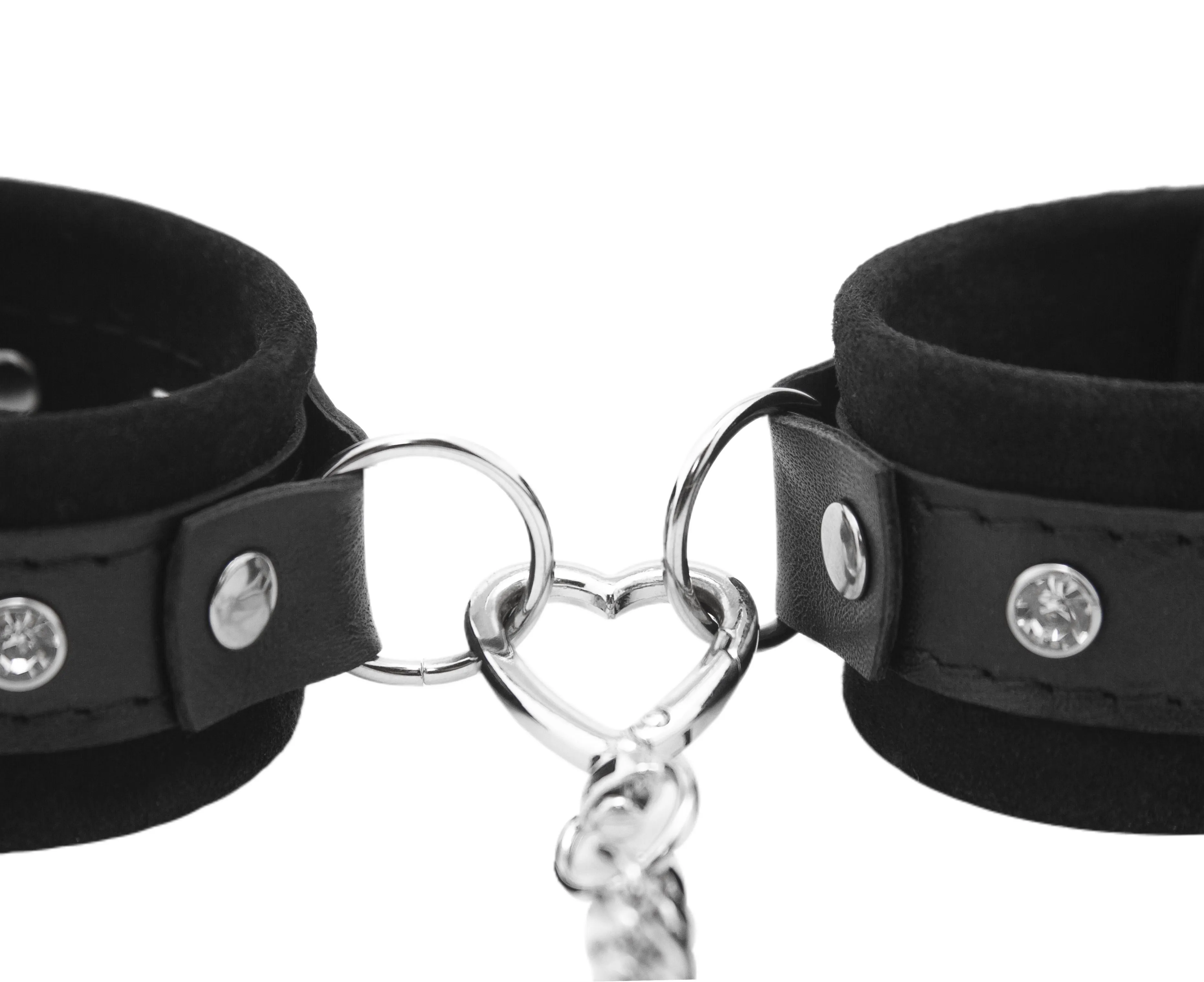 Наручники сделаны из натуральной кожи черного цвета и соединены между собой карабином. Они регулируются по размеру при помощи ремешков с пряжками.