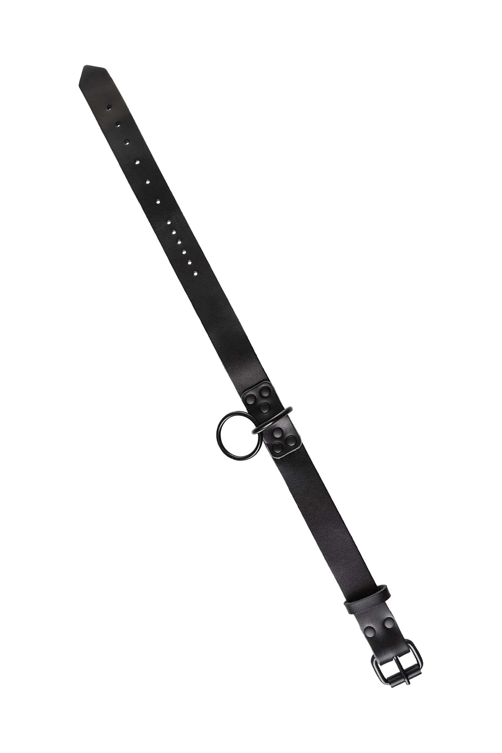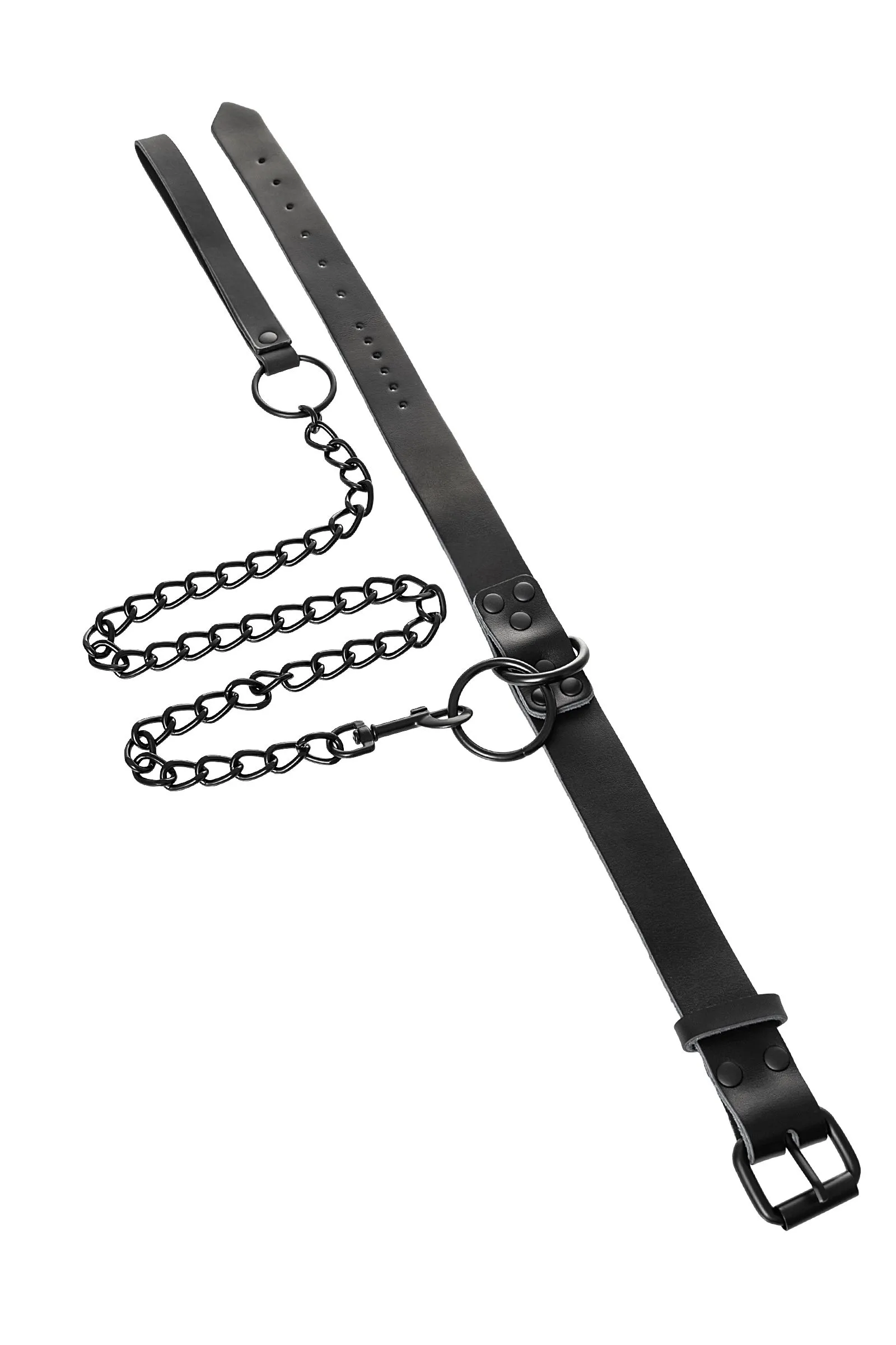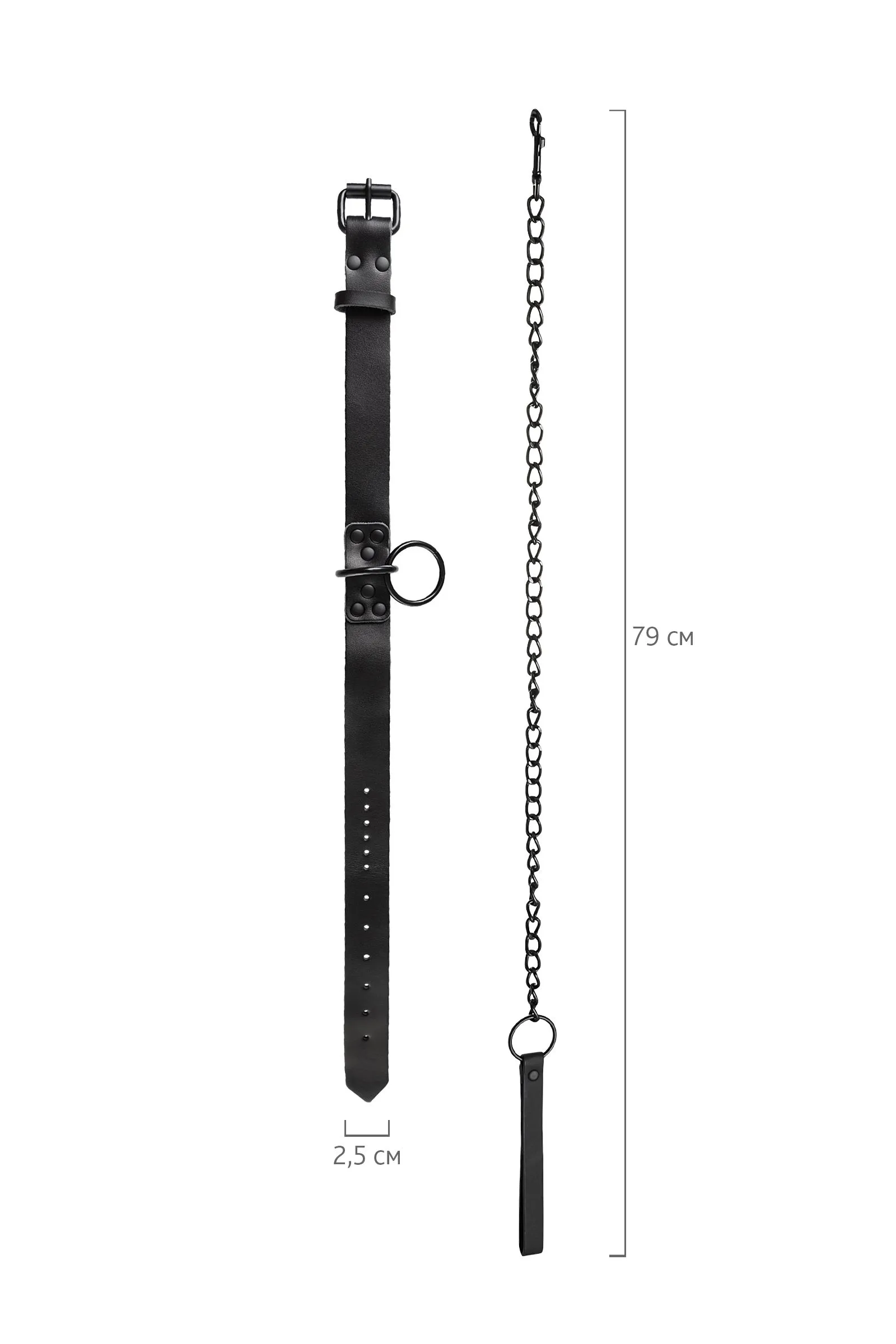Кожаный ошейник с поводком В черной-черной комнате, в черном-черном ошейнике… Этот ошейник из черной кожи с черной же цепочкой-поводком нельзя назвать просто ограничителем свободы. Вся металлическая фурнитура выдержана в стиле строгого подчинения, не отвлекая внимание от игрового процесса. Он станет для вас стильным аксессуаром и дополнит любой образ. В нем придется следовать за Господином, но это будет очень элегантно! Благодаря универсальным цвету и форме, он подойдет партнеру любого пола, размер регулируется пряжкой. Поводок имеет ручку из кожи, крепится к кольцу ошейника карабином. Длина ошейника 58 см Ширина ошейника 2,5 см Длина поводка 79 см В фотосессии на модели использованы пэстис Theatre 705006