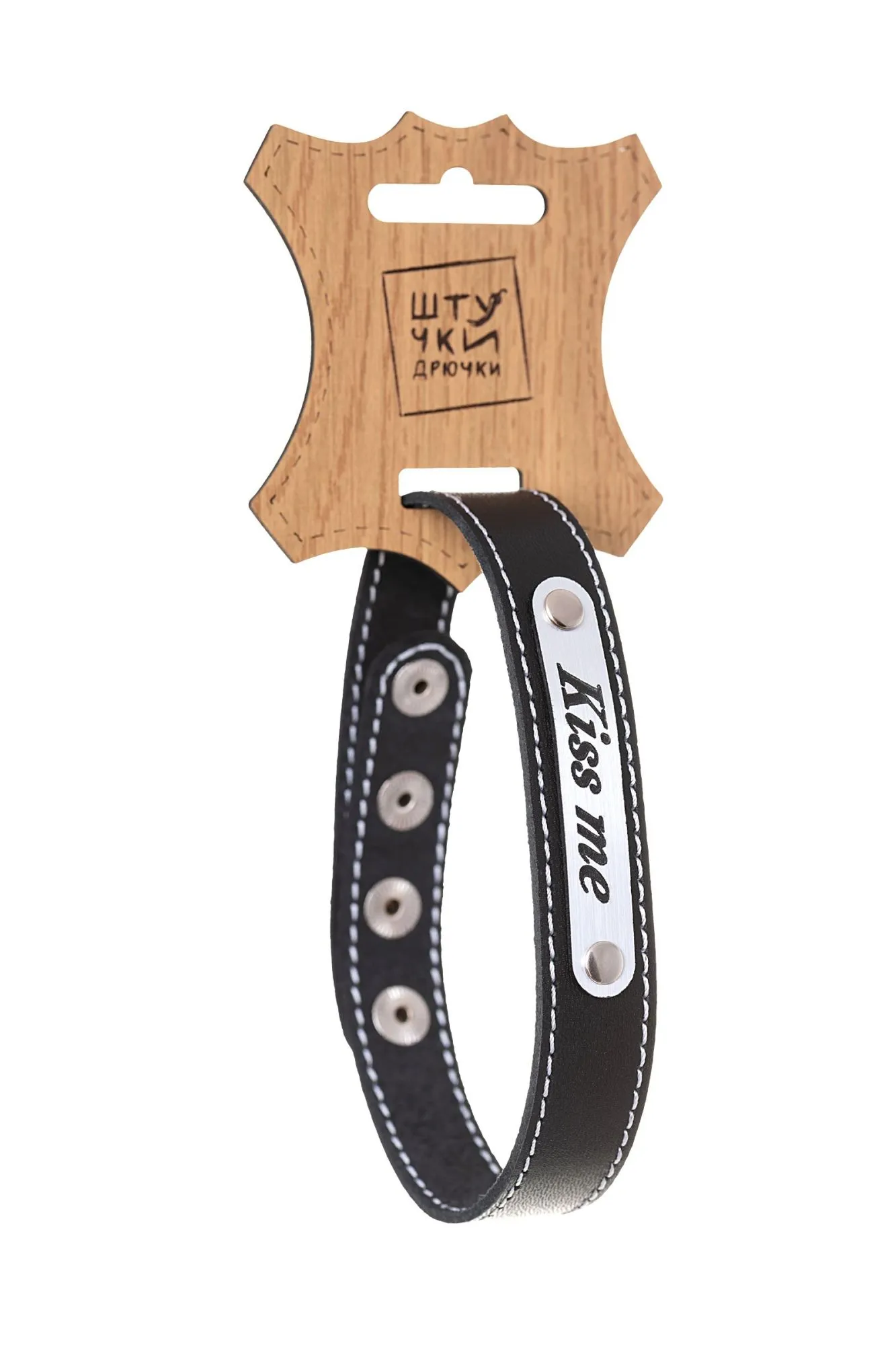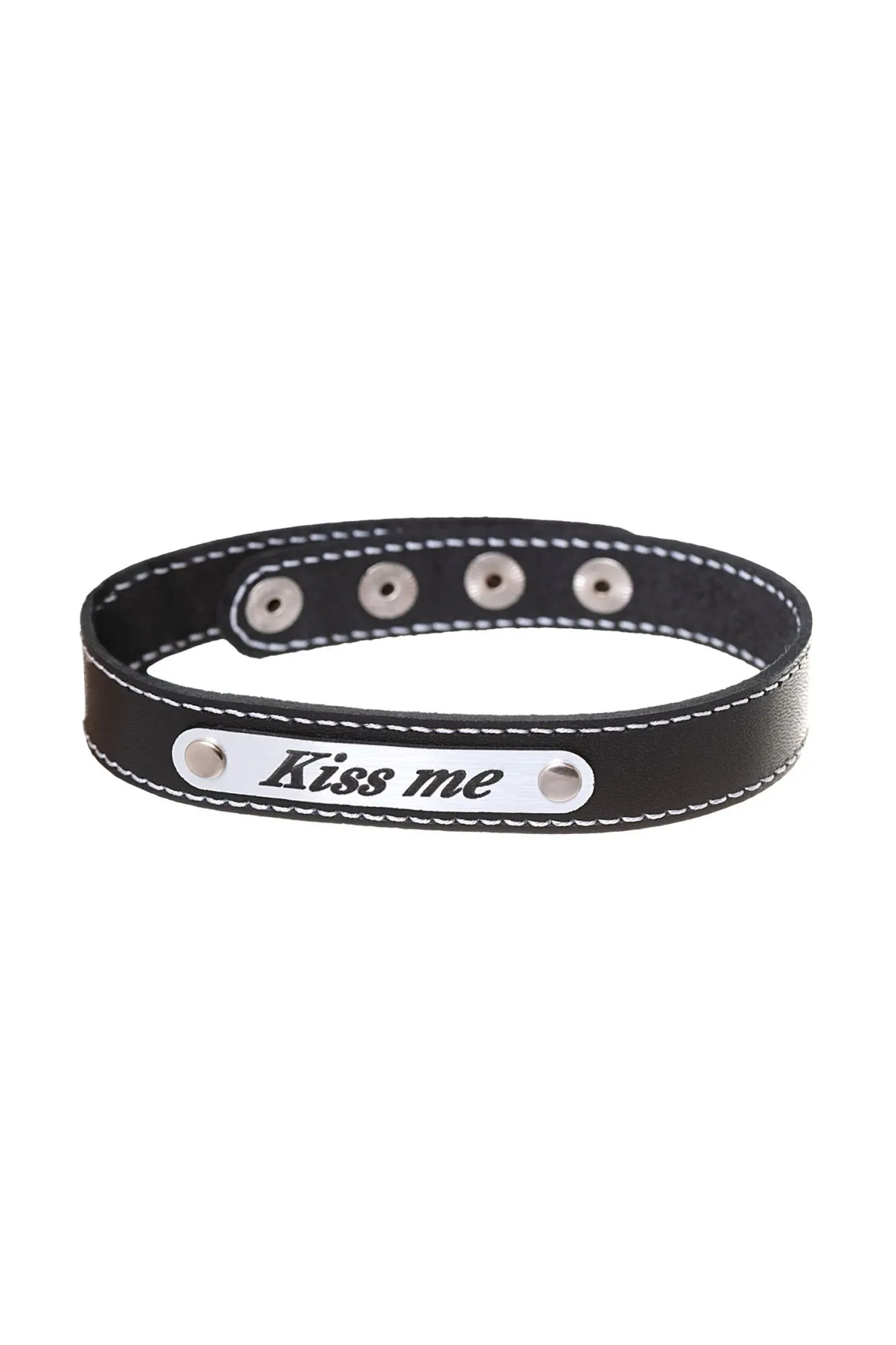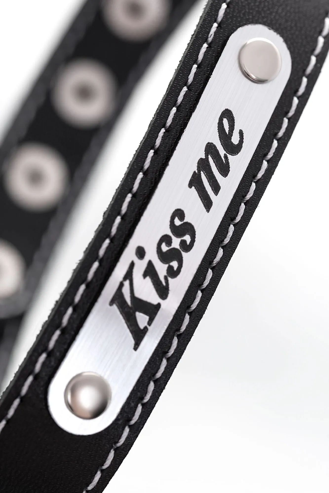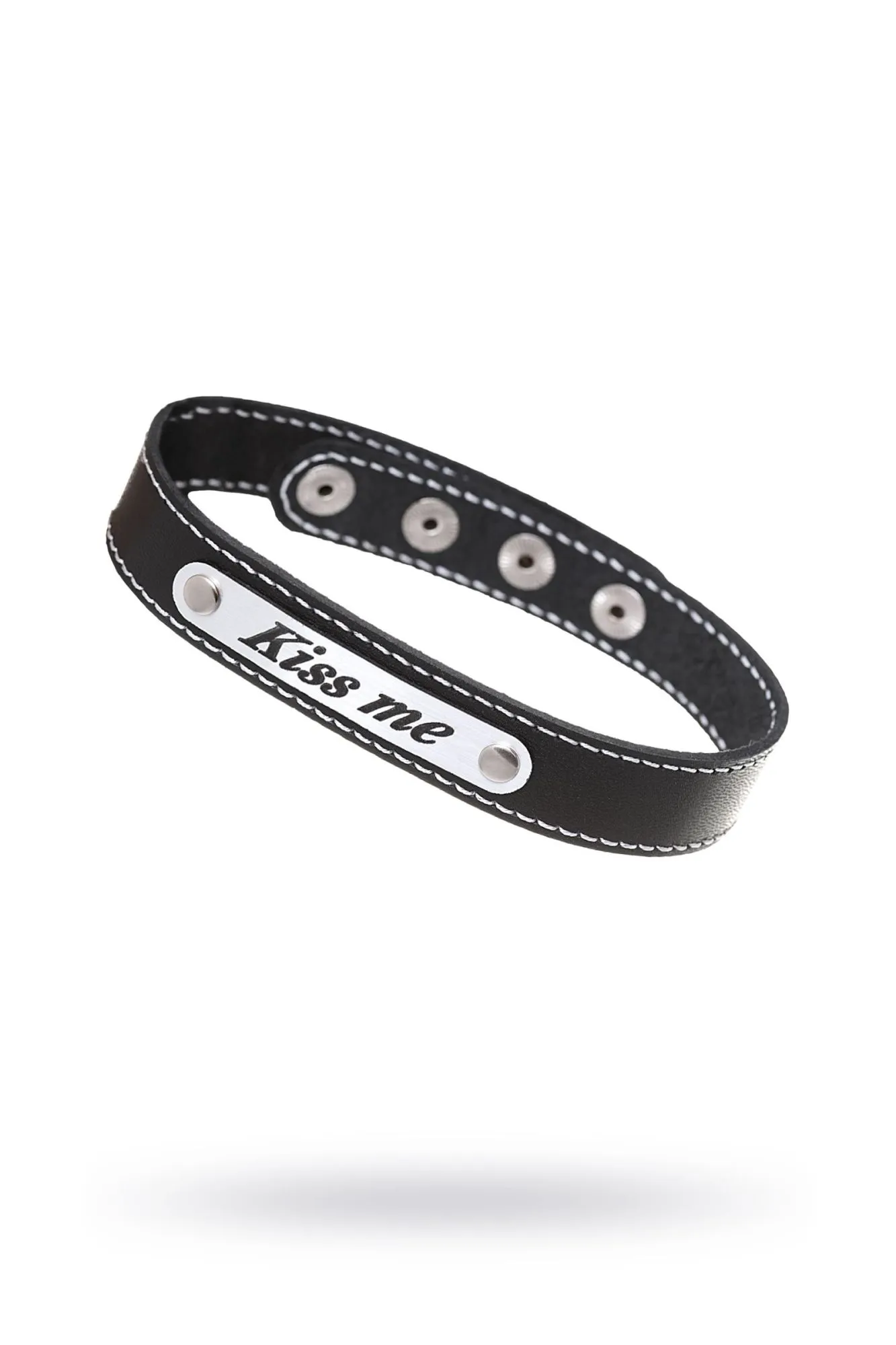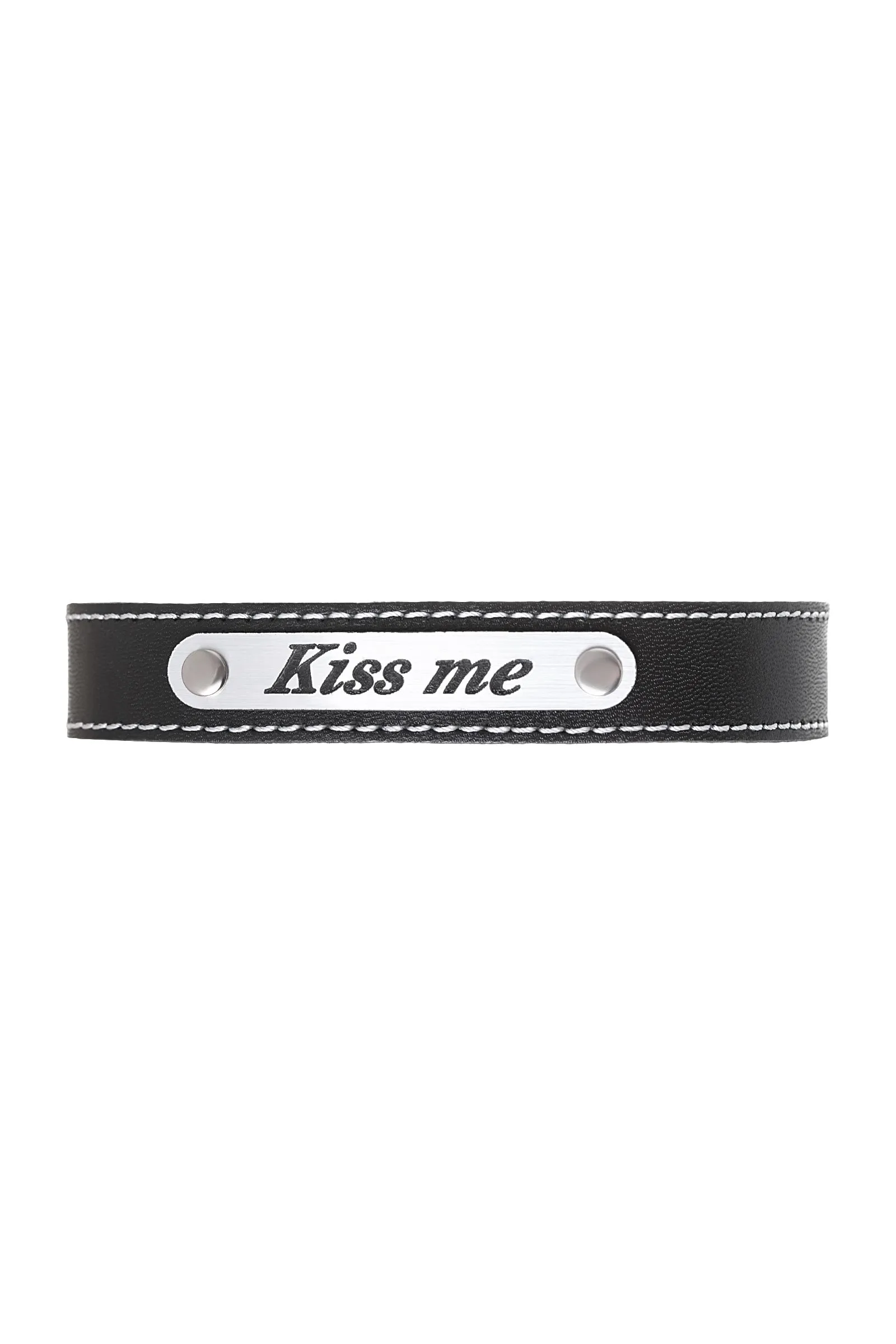 Чокер изготовлен из натуральной кожи и дополнен вставкой под металл с надписью Kiss me. Регулируется при помощи кнопок. Общая длина 41 см