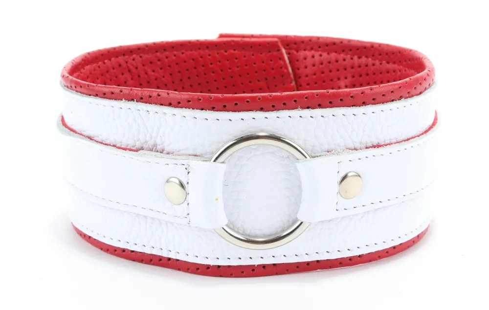 Ошейник с внешней стороны белого цвета, с внутренней-красного цвета, выполнен из высококачественной кожи. Ширина составляет 6 см. Длина-41 см. Размер регулируется застёжкой. Для крепления различных элементов бандажа, а также поводков и цепочек на БДСМ девайсе предусмотрено одно D-видное кольцо.