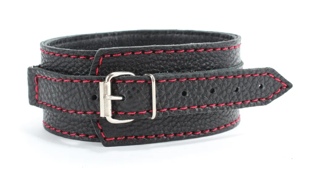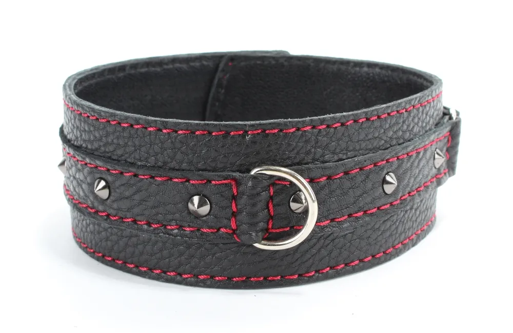 Черный кожаный ошейник с красной отстрочкой. Декорирован небольшими шипами в передней части изделия. Имеет D-кольцо для карабина. Характеристика: ширина ошейника - 5 см, общая длина ошейника- 41см. Имеет 7 отверстий для регулировки размера.