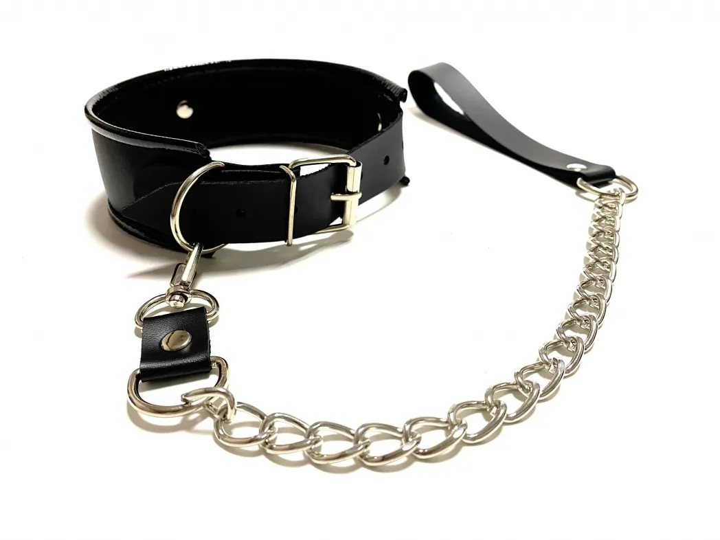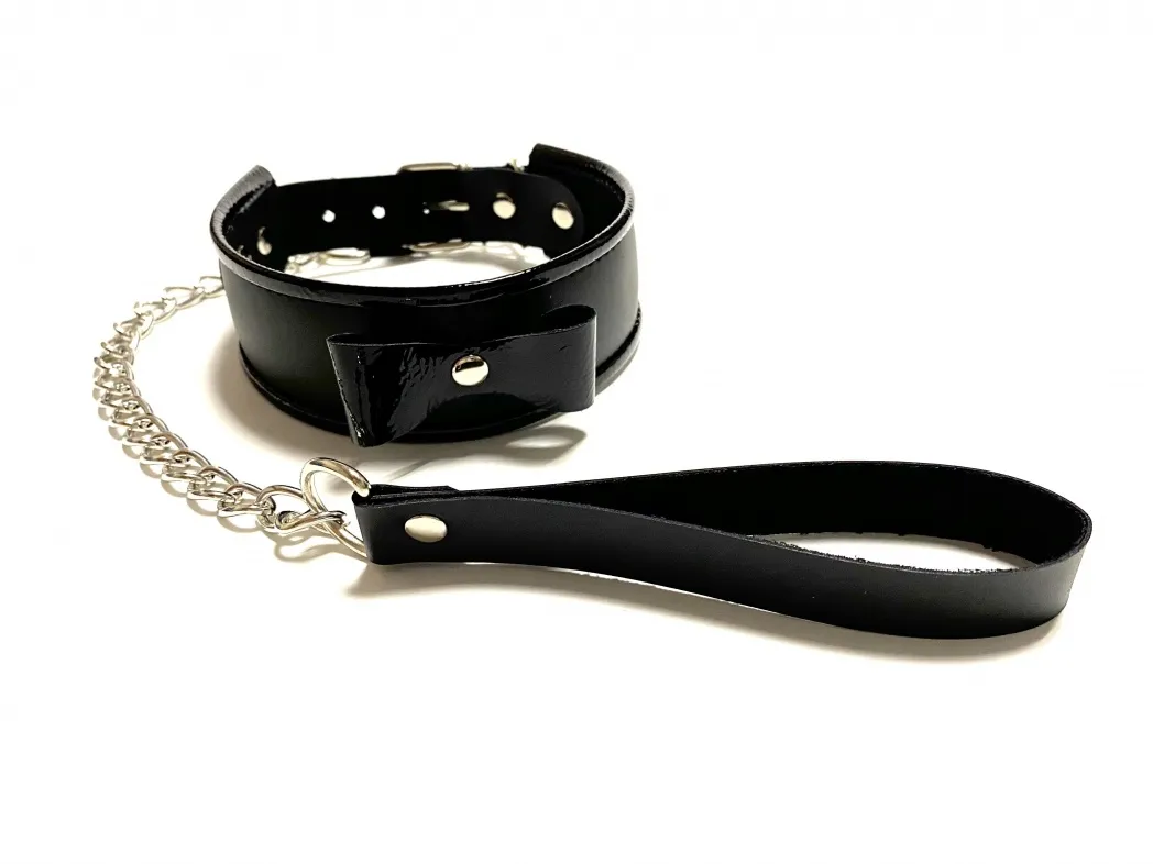 Комплект аксессуаров из ошейника с металлическим поводком, выполненный из черной искусственной кожи. Ошейник декорирован бантиком спереди и металлическим полукольцом, к которому пристегивается поводок. Основная часть выполнена из матовой эко-кожи, а бант и вставки по краю - из лаковой, что придаёт ошейнику изящества. Общая длина ошейника вместе с пряжкой и ремешком 47см, ширина 4,5см. Общая длина поводка,включая карабин и петельку, 45см. Этот комплект поможет добавить разнообразия и стать волнующим элементом любовной игры. Экономичный, экологичный и функциональный аксессуар! Материал: эко-кожа, металл Цвет: черный