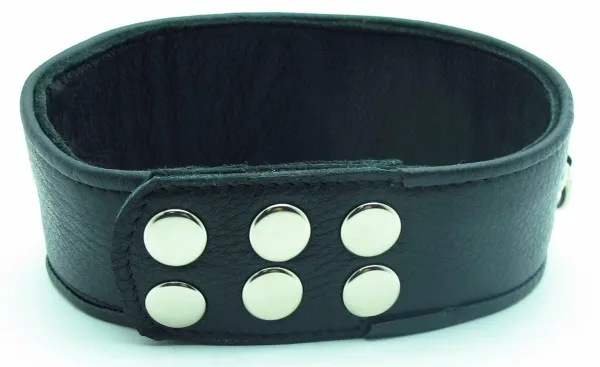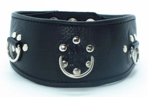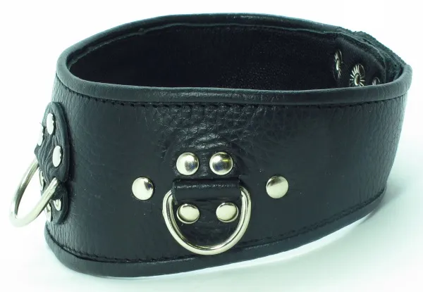 Широкий ошейник для БДСМ игр в качестве наказания за провинность. Фетиш-изделие черного цвета с  хромированными заклепками, которые добавляют аксессуару дерзости. В ошейник вставлены 3 D-кольца, с ними фетиш-изделие соединяется с бандажом или поводком. Вы символически посвящаете партнера в сексуальное рабство, ведущая роль всецело принадлежит именно Вам. Характеристики ошейник кожаный с клепками: цвет – черный, материал – кожа,  макс. ширина в передней части – 6 см